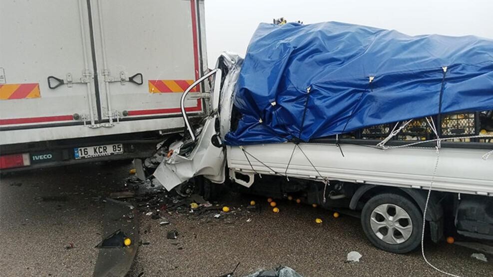 Bursa İzmir karayolunda feci kaza meydana geldi. Tıra arkadan çarpan kamyonet akordeon gibi içine geçti. Sisin de etkili olmasıyla farklı noktalarda 3 zincirleme kaza meydana geldi. Kazalarda çok sayıda araç birbirine girdi.