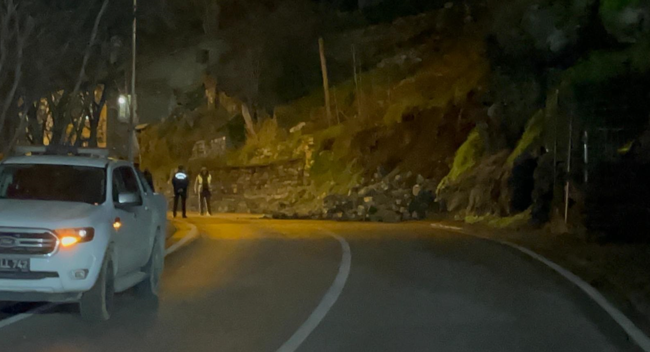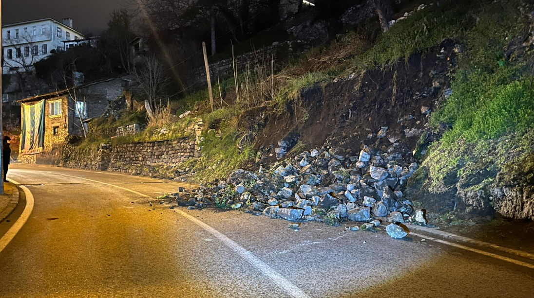 BURSA’nın Osmangazi ilçesinde istinat duvarının çöktü. Düşen toprak ve taşlar nedeniyle yol, çift yönlü olarak trafiğe kapatıldı.
