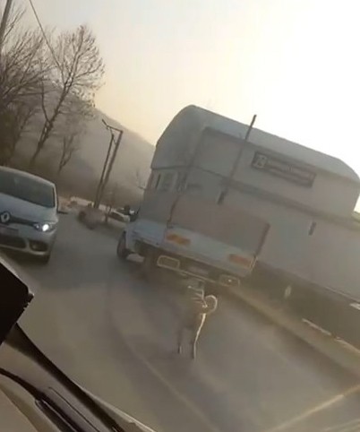 Bursa'da bir kişi kamyonete bağladığı köpeğe eziyet ederek kilometrelerce götürdü. O anlar ise cep telefon kamerasına yansıdı. Sürücüye eziyet eden sürücü ise yakalanarak cezai işlem uygulandı.