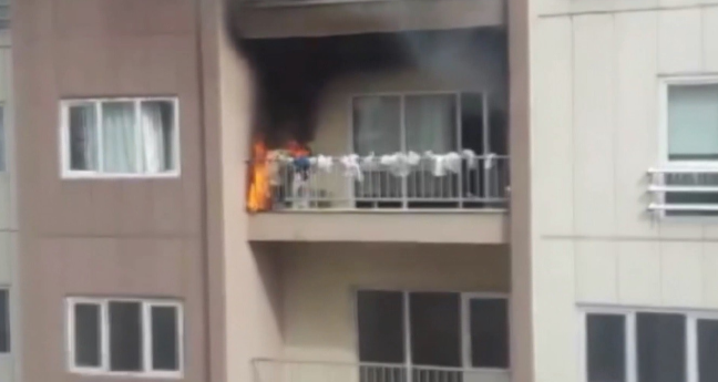 İçeriden bir damacana suyla balkona geri gelen ev sahibi yangını kısa süre söndürmeyi başardı.Karşı binada bulunan başka komşusu o anları cep telefonu ile anbean kaydetti.