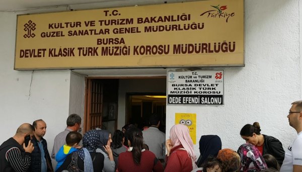 Bursa Devlet Klasik Türk Müziği Korosu Dede Efendi Salonu'nda sahnelenecek olan Minyonlar Müzikli Çocuk Tiyatrosu'nun gösterisini izlemek isteyen çocuklar ve aileleri, sonu bitmeyen kuyruk oluşturdu.