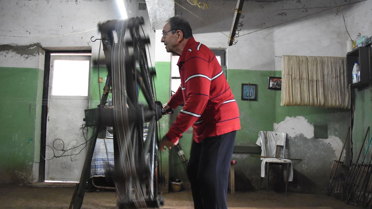 Geleneksel yöntemlerle iplik büken Şengünalp’in çalışma temposu, dikkat çekiyor. Ham ipeği temizlenmiş ve parlatılmış kuzu kemiğine bağlayan zanaatkar, ipliğin bükülmesi ve düzeltilmesi aşamasında tezgahın başında adeta mekik dokuyor. Günde ortalama 6 saat mesai harcayan Şengünalp, eski yöntemlerle ham ipekten ip hazırlamak için her gün yaklaşık 20 kilometre koşuyor. Bu işlemlerin ardından, tezgahın arkasında bütün verme işlemi başlıyor ve çarkı çevirerek yapılacak işe göre ipliğe kat sayısı veriliyor. Katlama işlemi bitince iplikler arşına sarılıyor ve boyamaya hazır hale geliyor. Şengünalp, saatlerce süren koşu, çark çevirme ve katlama işlemlerinin ardından ise gün sonunda sadece 700 gram kaliteli ipek ip elde edebiliyor.