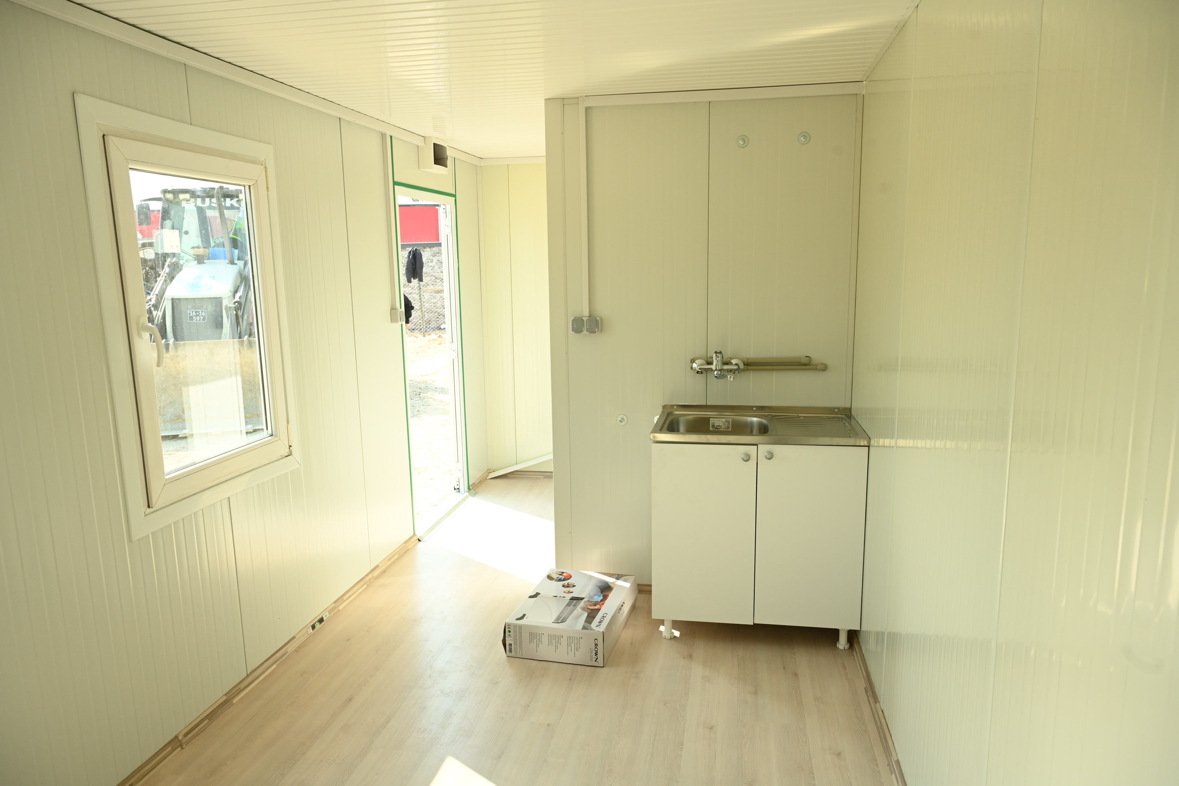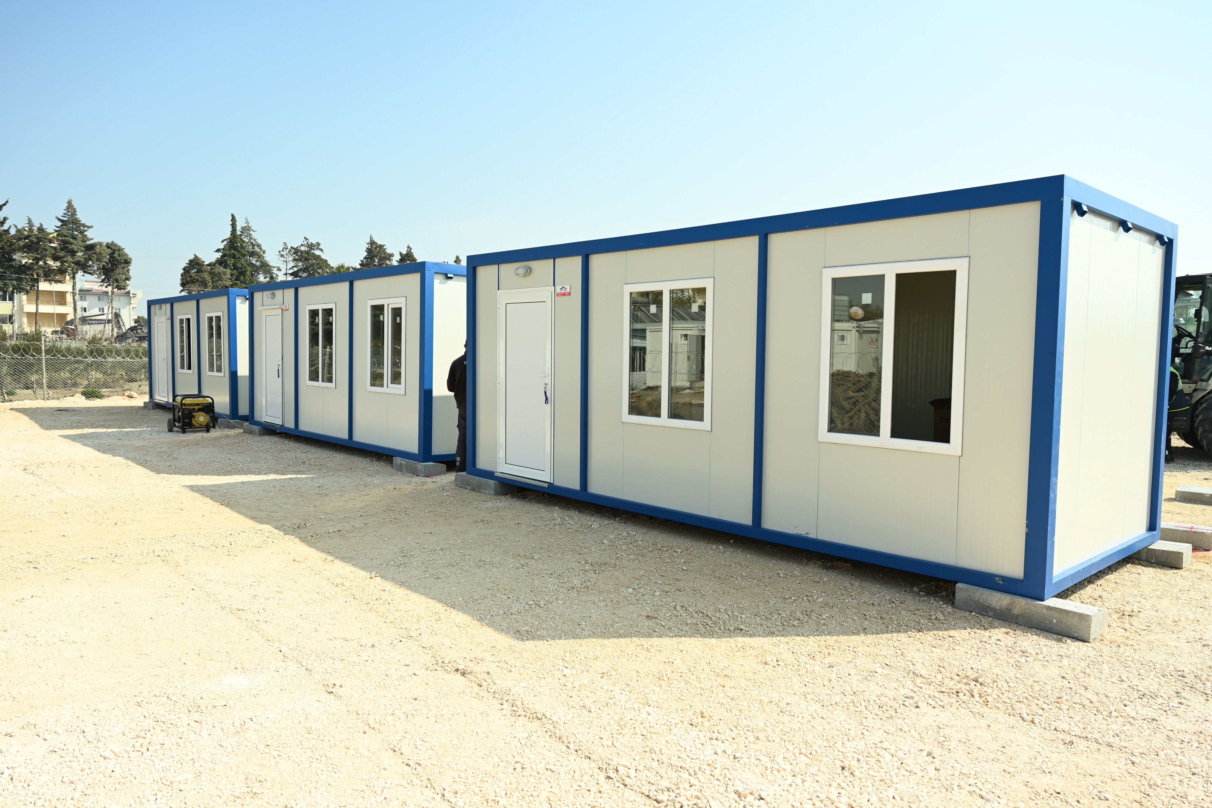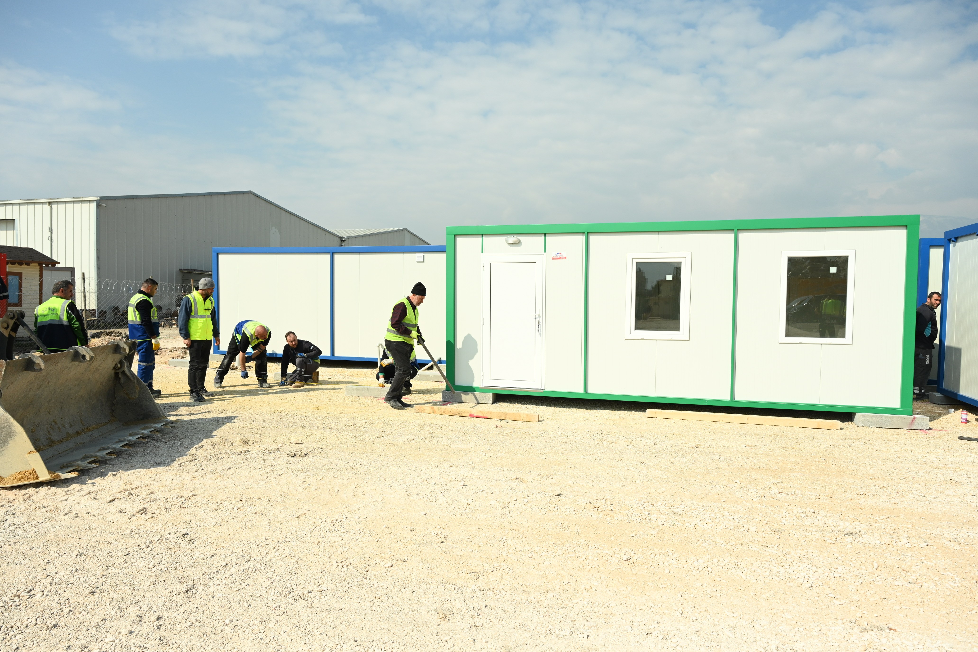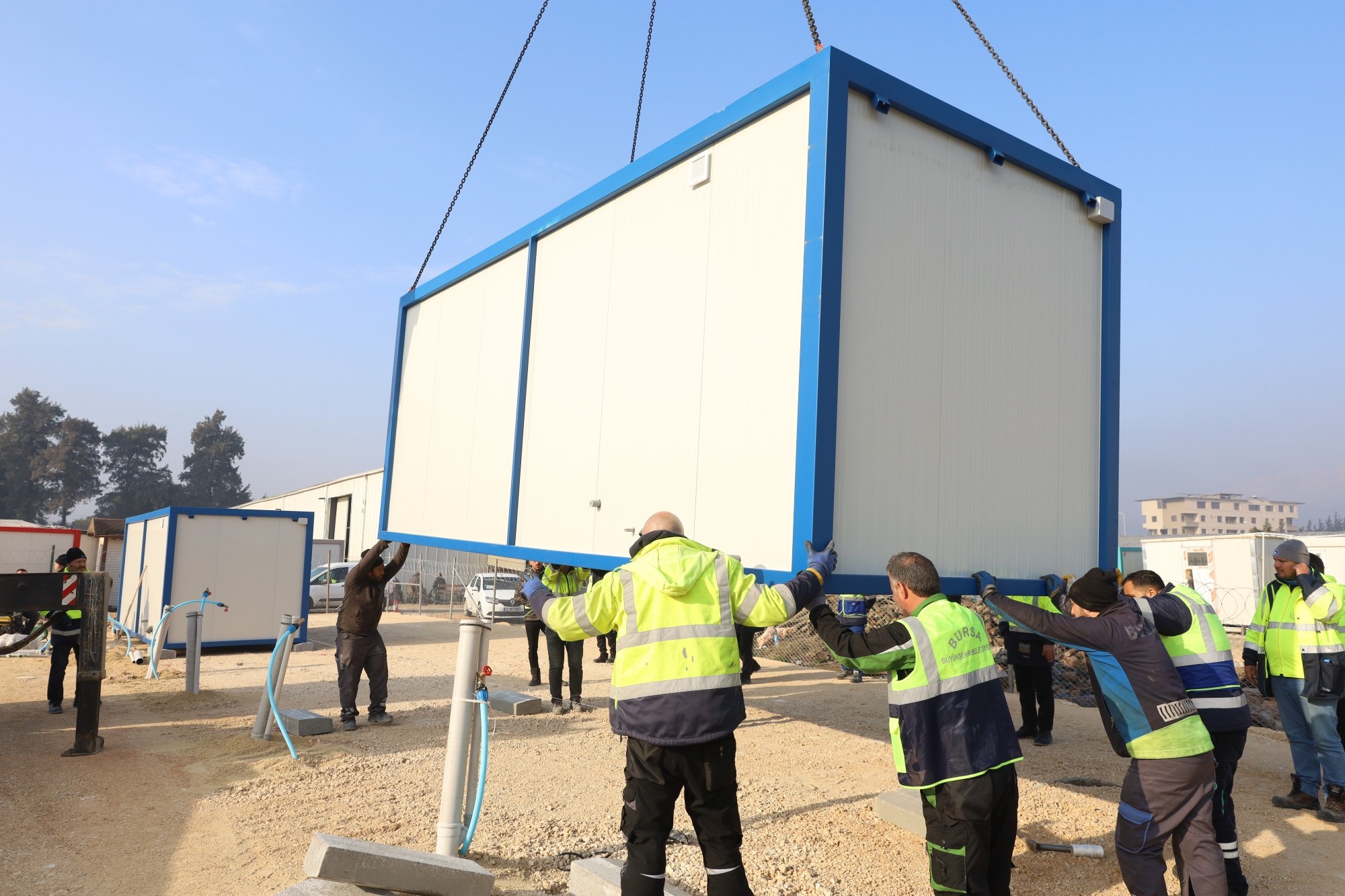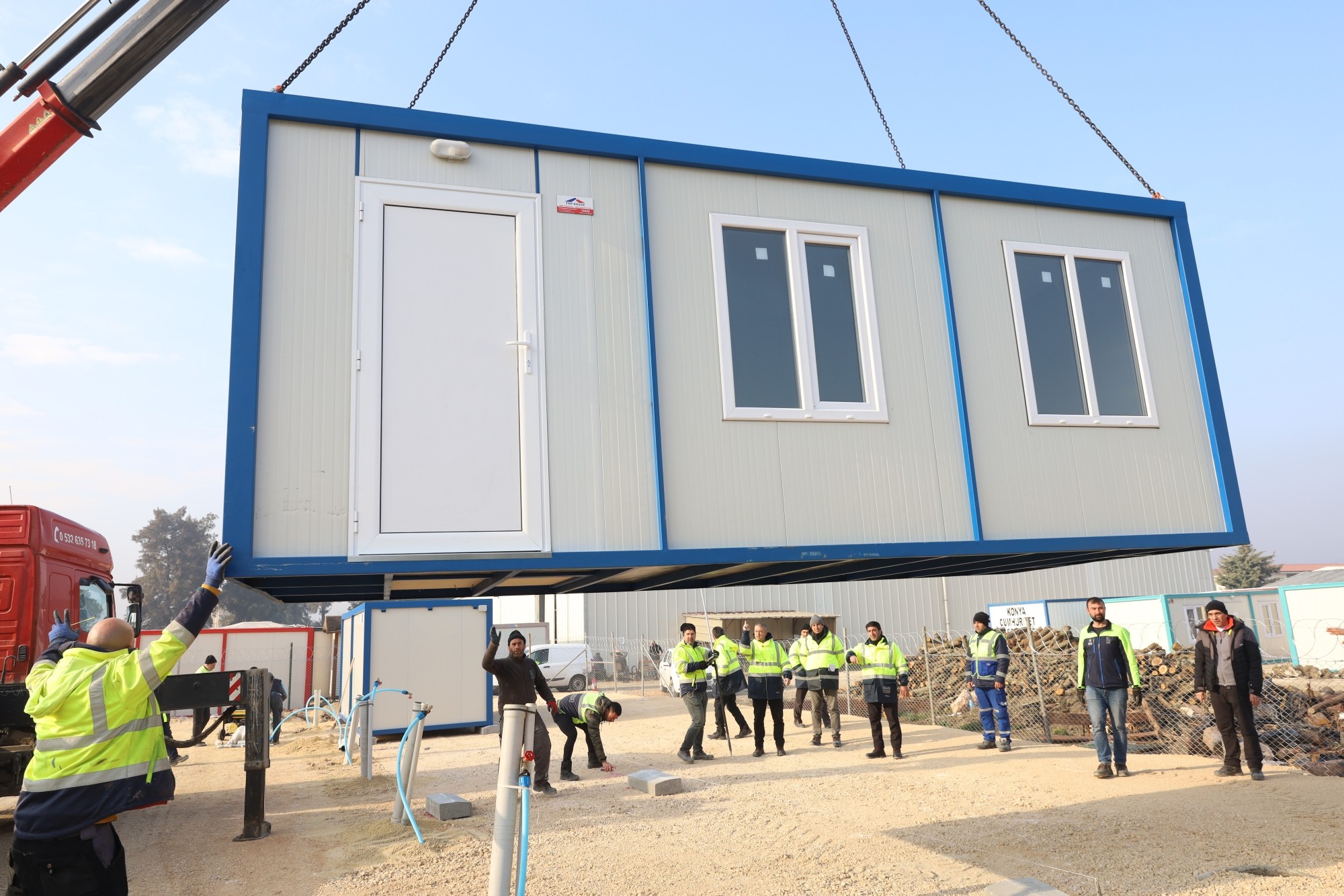 Türkiye’yi yasa boğan, 11 ilde büyük yıkımlara yol açan depremin hemen ardından Gaziantep’in İslahiye ve Nurdağı ilçelerinde görevlendirilen, depremin sekizinci gününde ise büyük yıkımın yaşandığı Hatay’a çekilen Bursa Büyükşehir Belediyesi, bölgede yaraları sarmaya devam ediyor. Hatay’da üstlendiği üç ana görevden biri de konteyner kentler kurulumu olan Bursa Büyükşehir Belediyesi, üç ayrı bölgede 110 bin metrekare alana toplam 2 bin konteynerlik kent oluşturacak. Geçici konaklama alanında barınacak olan depremzedelerin günlük hayatlarını devam ettirebilmeleri amacıyla konteyner kentlerde sağlık ocağı, ibadethane, berber, çocuk oyun alanları, örgün eğitimi devam ettirebilecekleri çok amaçlı çadırlar, yemekhane ve çamaşırhane gibi sosyal yaşam alanları bulunacak. Toplam 110 bin metrekarelik alanda 30 bin metreküp kazı işlemi bitirilirken, 155 bin ton dolgunun 90 bin tonu tamamlandı. İlk konteynerlerin geleceği alandaki içme suyu ve kanalizasyon hatları, BUSKİ tarafından yapıldı. Bölgeye ilk gelen konteynerlerin montajına ise başlandı. Tırlardan indirilen ve içinde tuvaleti, banyosu ve mutfak tezgahı bulunan konteynerler, plan dahilinde alana yerleştirildi.