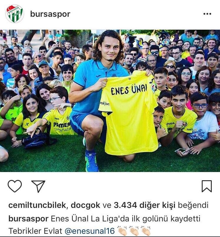 Bursaspor, sezon başında Villarreal'e transfer olan altyapısında yetiştirdiği eski futbolcusu Enes Ünal'a yeni takımıyla ilk kez gol sevinci yaşadığı için sosyal medya hesabından, "tebrikler evlat" mesajı gönderdi.