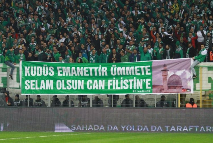 Bursa taraftarı tribünde "Kudüs emanettir ümmete, Selam olsun can Filistin'e" pankartı açtı.