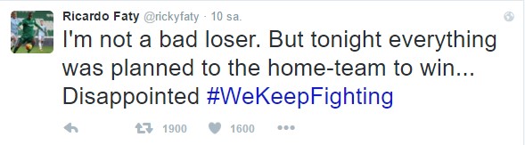 Faty, twitter hesabından yaptığı açıklamada, "Ben yenilince huysuzlanan biri değilim ama bu akşam her şey ev sahibi takımın kazanması için planlanmıştı. Hayal kırıklığına uğradım" yazdı.