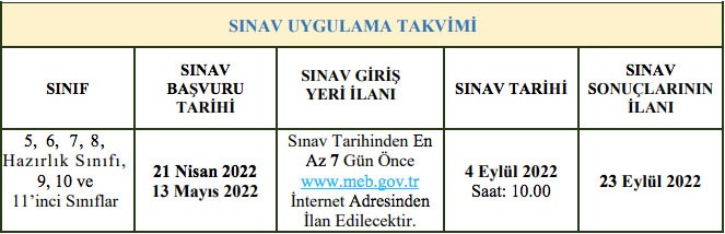 Resmi ve özel ortaokullar, imam hatip ortaokulları veya özel eğitim ortaokullarının 5, 6, 7 ve 8'inci sınıfları ile ortaöğretim kurumlarının hazırlık sınıfı, 9, 10 ve 11'inci sınıflarında eğitim gören öğrenciler özelinde düzenlenen sınav, 4 Eylül Pazar günü yapılacak.