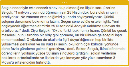 İOKBS bursluluk sınavı en zaman olacak? MEB Bakanı Ziya Selçuk, 25 Nisan'da yapılacak bursluluk sınavı ve Adaylık Kaldırma Sınavı'nın ertelendiğini duyurarak, şu ifadeleri kullandı: "1 milyon civarında öğrencimizin bursluluk sınavı var 25 Nisan'da, bunu erteliyoruz. Ne zamana erteliyoruz söyleyemiyorum, geçen sene eylüle ertelemiştik."