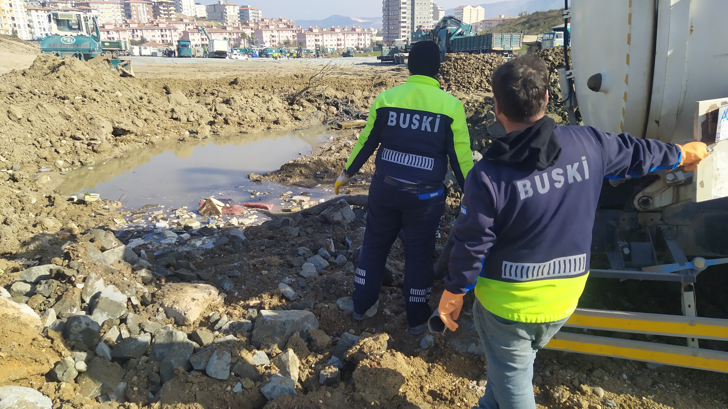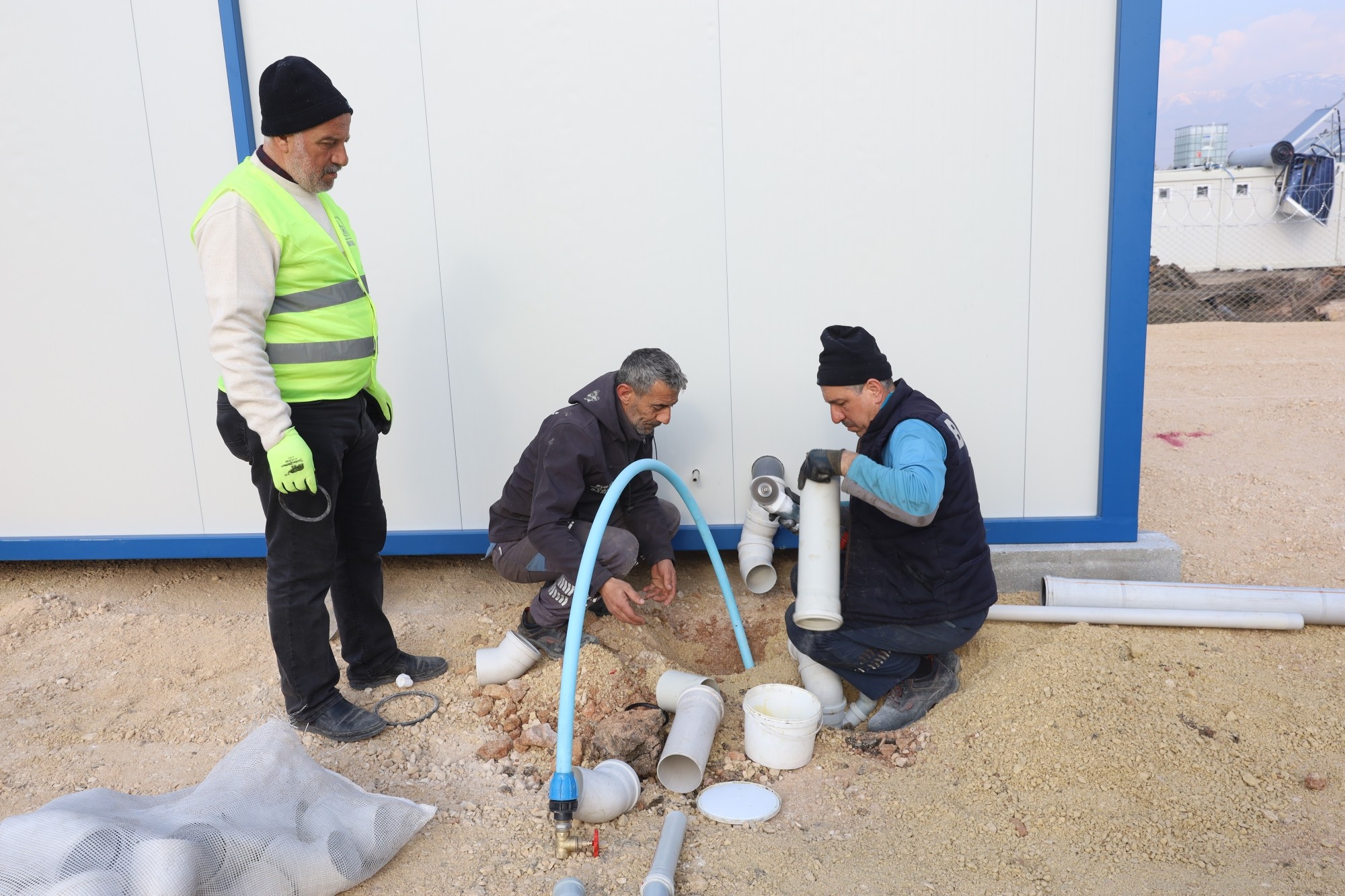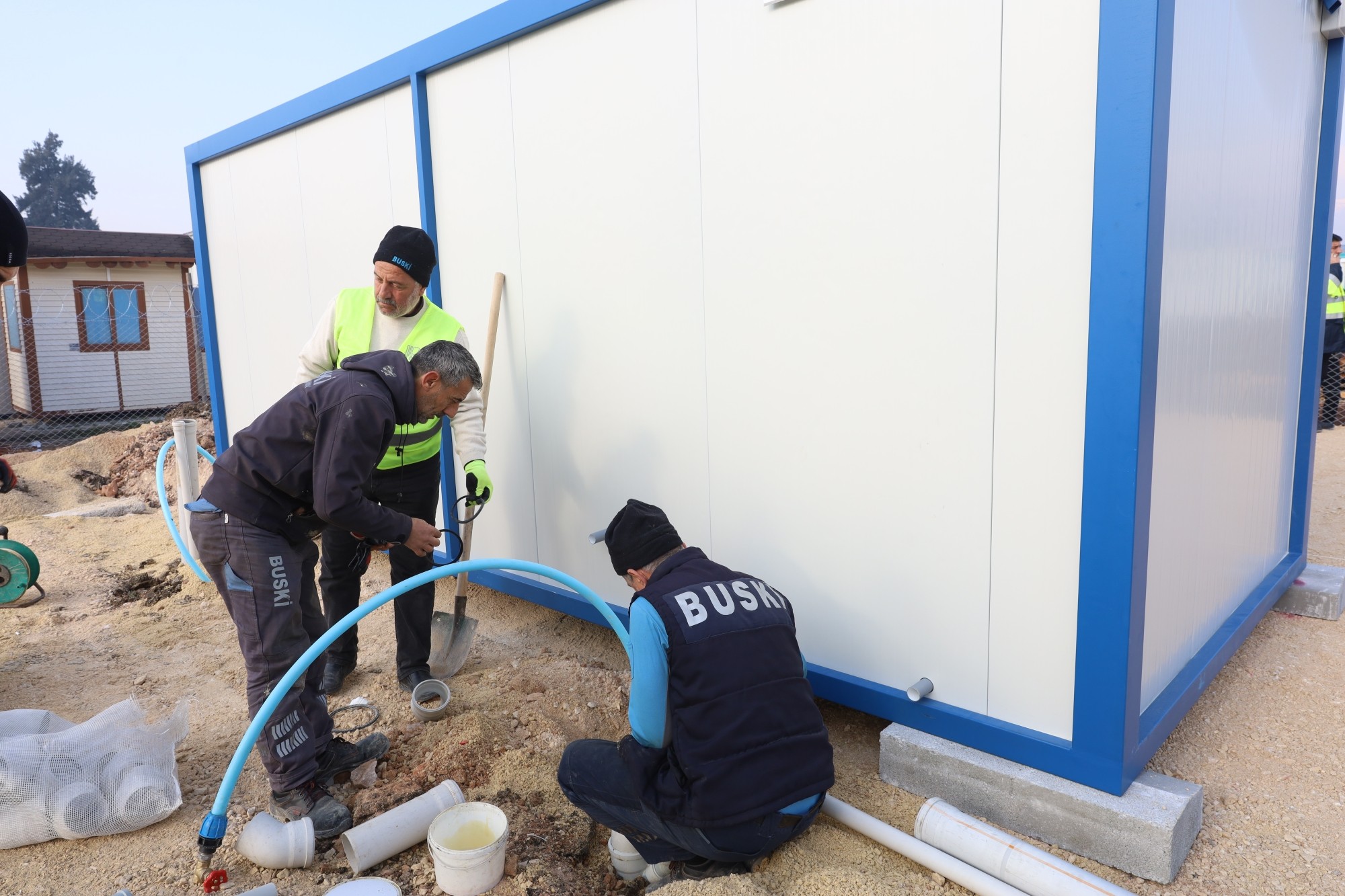 Hatay merkezde önceliği ‘Büyükşehir Belediyesi tarafından kurulacak’ konteyner kentlerin altyapısını hazırlamaya veren BUSKİ, toplam 3 bölgede 2 bin konteynerin yer alacağı 110 bin metrekare alanın içme suyu ve kanalizasyon hat bağlantılarını gerçekleştiriyor. Bugüne kadar 50 adet tuvalet ve duş için su ve kanal bağlantısını gerçekleştiren BUSKİ, seyyar tuvaletlere tankerlerle düzenli olarak su takviyesi yapıyor. İhtiyaç duyulan bölgelere seyyar tuvaletler kuran BUSKİ ekipleri, özellikle konteyner kentlerdeki altyapıyı bir önce hazırlamak için gece gündüz demeden yoğun çalışma sergiliyor.