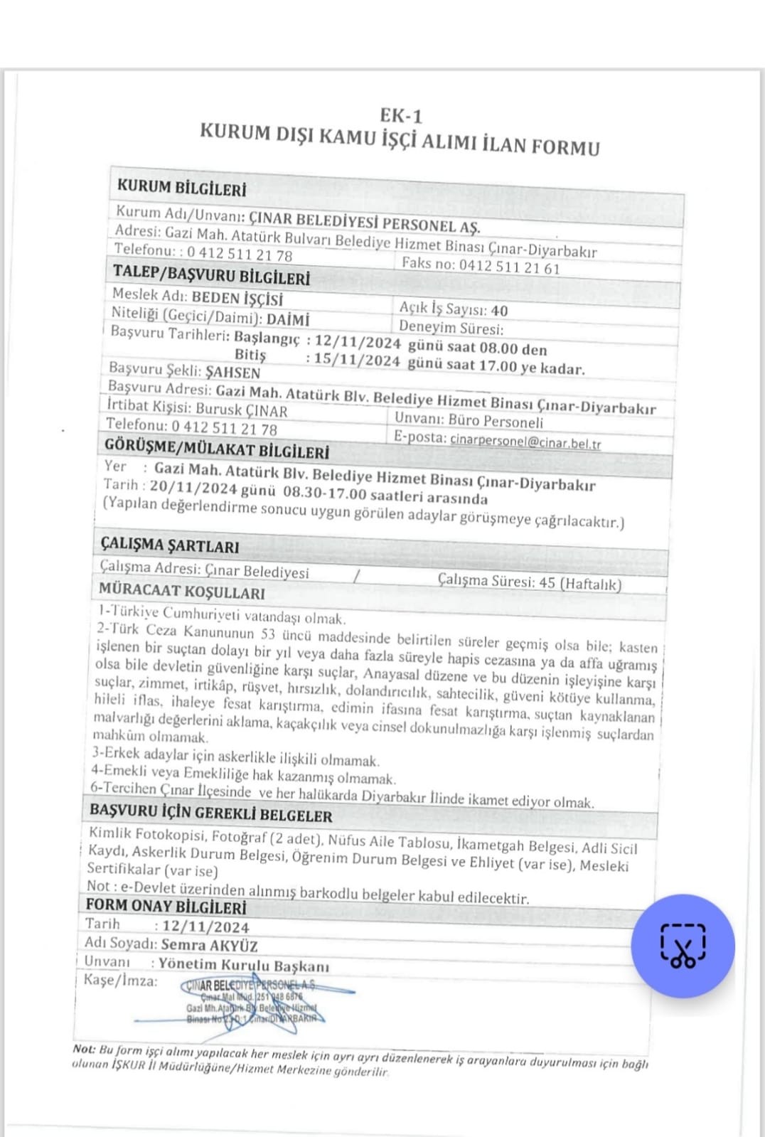 Diyarbakır'ın Çınar İlçesi Belediyesi, 40 daimi işçi alacak.