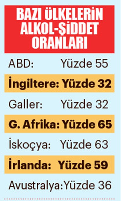 Birleşik Krallık Alkol Çalışmaları Enstitüsü’nün çalışmasına göre İngiltere ve Galler’de şiddet suçlarının yüzde 47’si içki etkisi altında işlendi. İrlanda’da aile içi şiddet vakalarının yüzde 59,6’sının kaynağı alkol illeti. İskoçya’daki şiddet suçlarının arka planında yüzde 63 oranında içki var.