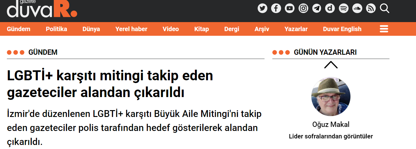 İzmir Büyük Aile Platformu'nun LGBTİ karşıtı mitingini takip ettiğim esnada güvenlik şube tarafından alandan kolumdan tutularak apar topar terörize edilip çıkartıldım. Gerekçe olarak 'Basın masın değilsin, can güvenliğin için alandan çıkman lazım. Provokasyona izin vermeyeceğiz' denildi.