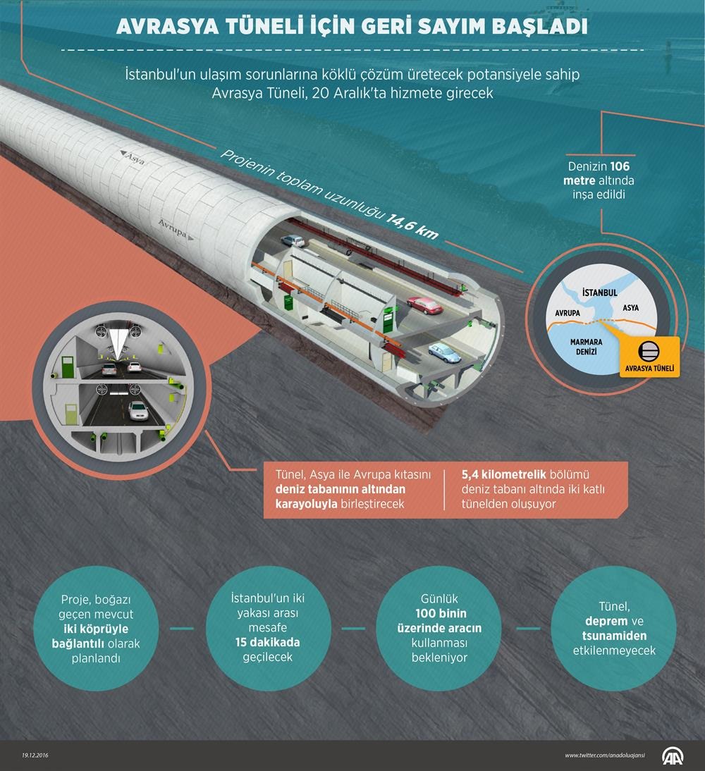 Deniz altındaki tünel inşaatının 22 Ağustos 2016 tarihinde tamamlanmasının ardından, karada devam eden bağlantı yolları çalışmalarında sona gelindi. Göztepe-Kazlıçeşme arasında hizmet verecek projenin toplam uzunluğu 14,5 km iken bunun 5.4 kilometrelik bölümü deniz tabanı altında inşa edildi. Proje otomobillerin ve minibüslerin geçeceği 2'şer şeritli ve iki katlı tünelden oluşuyor. Tünelin en derin bölümü deniz seviyesinden 106 metre aşağıda bulunuyor.
