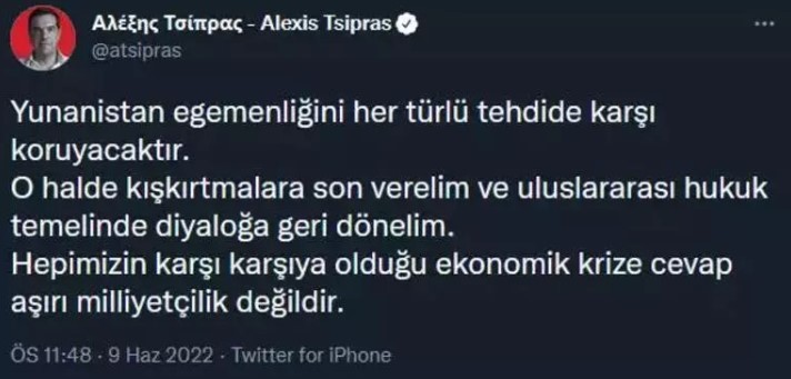 Muhalefet lideri, eski başbakan Aleksis Çipras sosyal medya hesabından "Yunanistan egemenliğini her türlü tehdide karşı koruyacaktır" mesajını Türkçe olarak paylaştı.