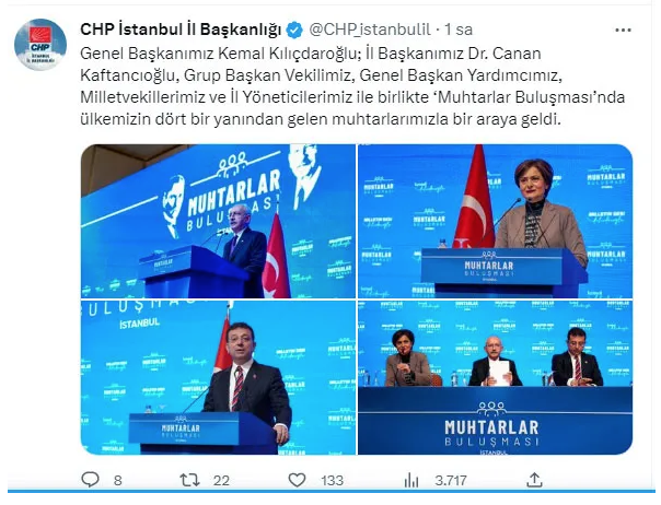 CHP'nin düzenlediği Muhtarlar Buluşması’nda, CHP İstanbul İl Başkanlığı tarafından yapılan paylaşımda, Canan Kaftancıoğlu'nun siyasi yasağı dikkate alınmadı ve kendisinden CHP İstanbul İl Başkanı diye bahsedildi.