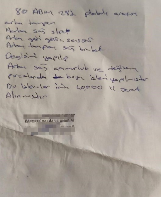 Adana’da 8 Nisan 2024’te 80 ARM 281 plakalı otomobiliyle kazaya karışan Davut Tiken, tutanak sonrası arkadaşının işlettiği kaportacıya gitti. Otomobilinin sağ arka tarafı hasar gören Tiken’in aracına 40 bin TL’lik masraf yapılacağı ve hasar kaydı işlenmeyeceği söylendi. Ancak işlemlerden sonra iddiaya göre Tiken’in aracına 78 bin 29 TL hasar kaydı işlendi ve buna karşılık 18 bin 383 TL ’değer kaybı’ ödendi.