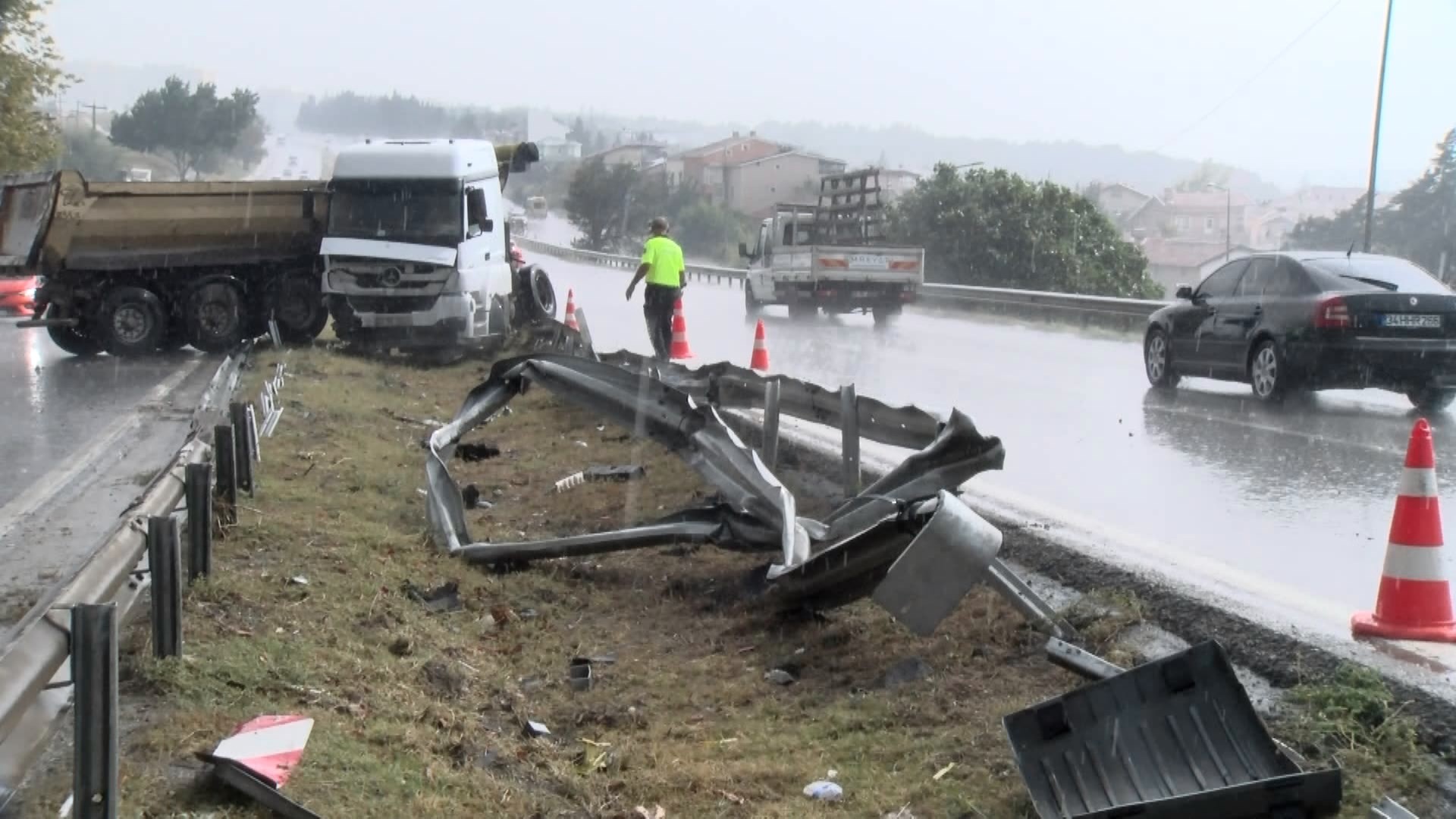 Kaza, Büyükçekmece Güzelce mevki D-100 karayolunda saat 11.30 sıralarında meydana geldi. 34 DU 2660 plakalı hafriyat kamyonunun sürücüsü yağışlı havanın da etkisiyle direksiyon hakimiyetini kaybederek bariyerlere çarptı. Çarpmanın etkisiyle ters dönen hafriyat kamyonu D-100 karayolunda trafiğin yoğunlaşmasına neden oldu.