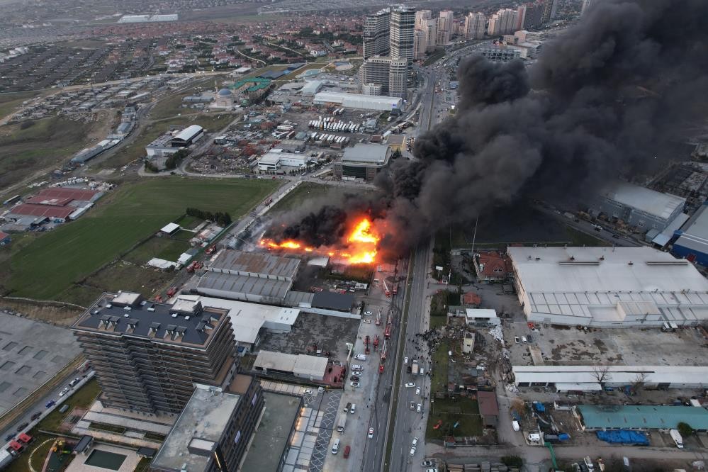 İtfaiye ekiplerinin müdahalesi devam ederken, alev alev yanan fabrika ve ekiplerin çalışması dronla havadan görüntülendi.