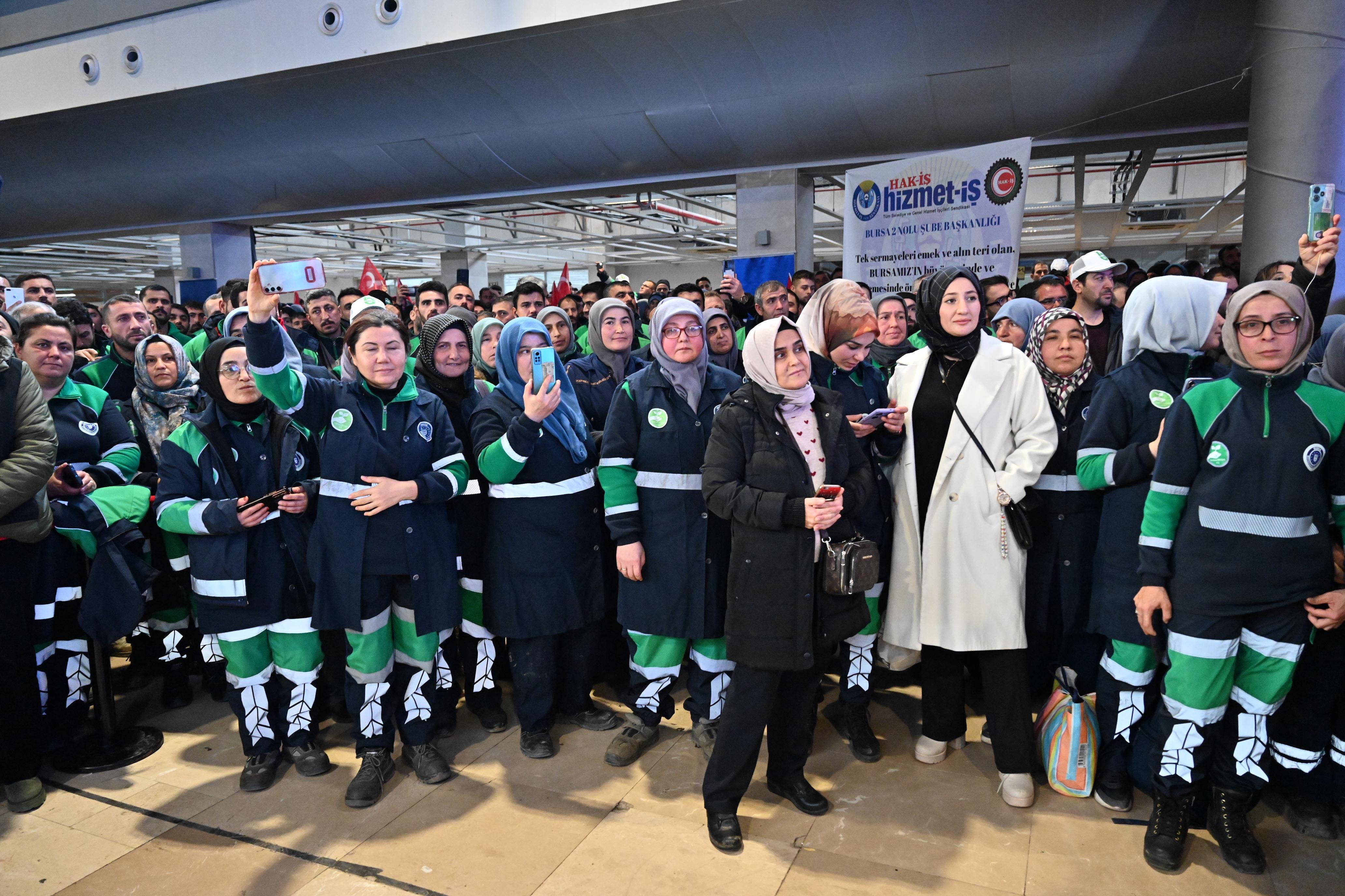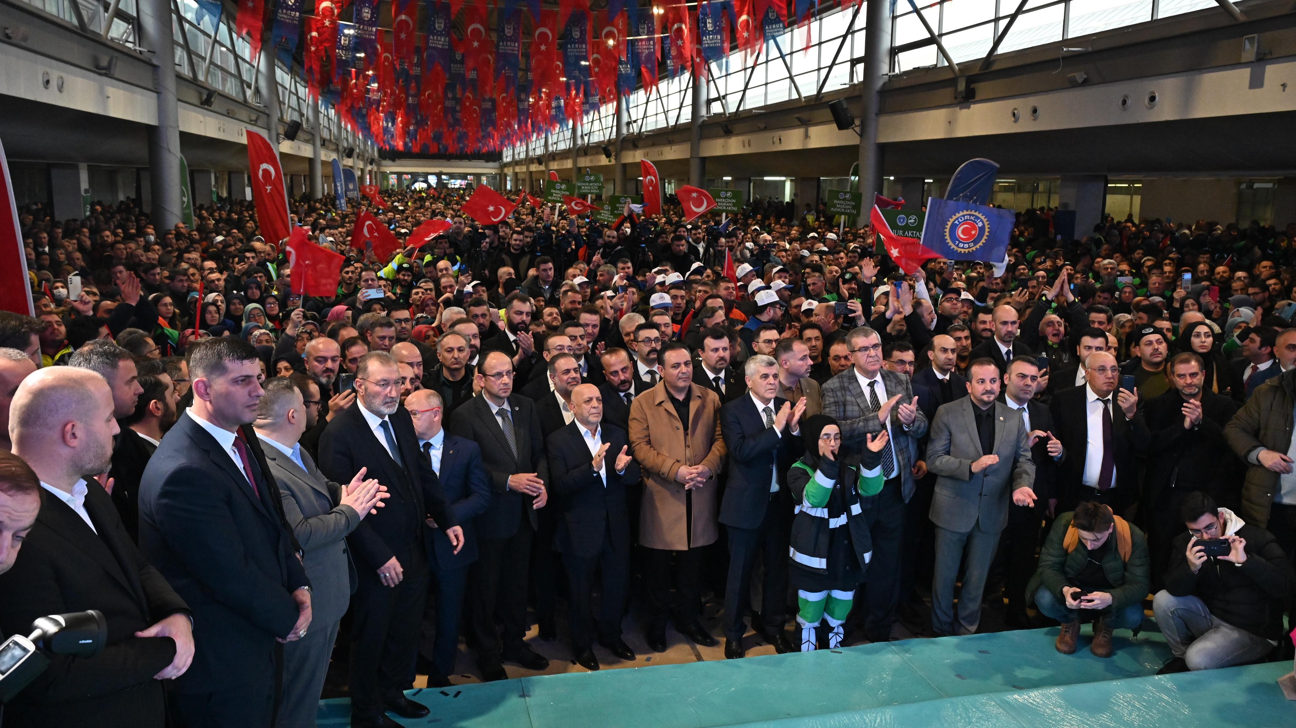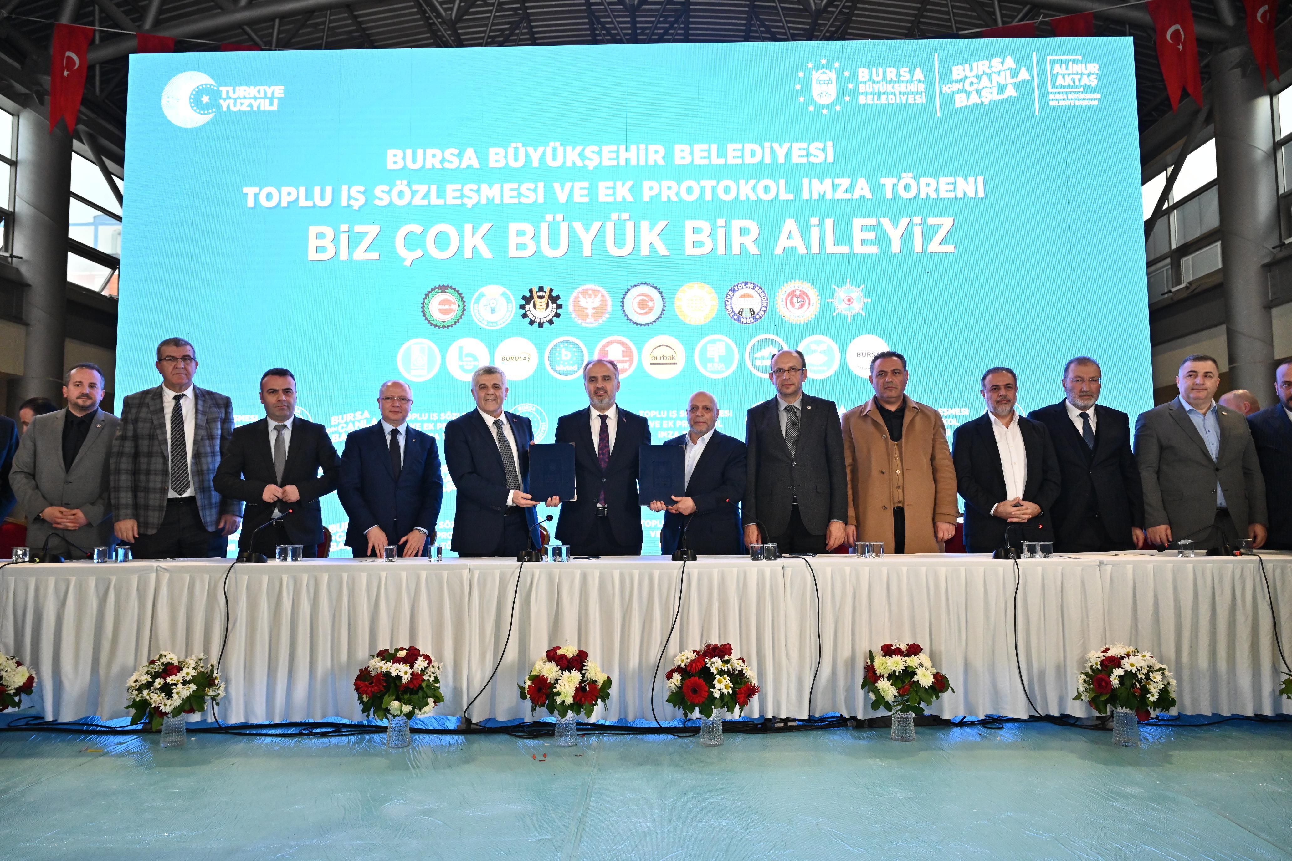 Bursa Büyükşehir Belediyesi, BUSKİ Genel Müdürlüğü, BİNTED Genel Müdürlüğü, BURULAŞ Genel Müdürlüğü, Kültür AŞ şirketi ile HAK-İŞ Sendikasına bağlı Hizmet-İş ve Özgüven-Sen Sendikası arasındaki toplu iş sözleşmesi, Merinos Atatürk Kongre Kültür Merkezi Fuaye Alanı’ndaki törenle imzalandı. Törene, Bursa Büyükşehir Belediye Başkanı Alinur Aktaş’ın yanı sıra Hak İş Konfederasyonu Genel Başkanı Mahmut Arslan, Bursa Milletvekilleri Mustafa Yavuz ve Refik Özen, Özgüven-Sen Sendikası Genel Başkanı Ömer Yılmaz, AK Parti İl Başkanı Davut Gürkan, MHP İl Başkanı Muhammet Tekin, Büyükşehir Belediyesi Genel Sekreteri Ulaş Akhan, BUSKİ Genel Müdürü Güngör Gülenç, Binted Genel Müdürü Nurcan Kırçova, Demiryol-İş Sendikası Sakarya Şubesi Başkanı Cemal Yaman, Hizmet İş Sendikası Bursa 2 Nolu Şubesi Başkanı Enes Şeker, Hak-İş ve Türk-İş Konfederasyonu’na bağlı sendikaların başkanları, yönetim kurulu üyeleri, şube başkanları, Büyükşehir Belediyesi bürokratları, çok sayıda belediye yöneticisi ve personel katıldı. Başkan Alinur Aktaş, toplu iş sözleşmesinin imzalanacağı alana alkışlar, konfetiler ve tezahüratlar arasında girdi.