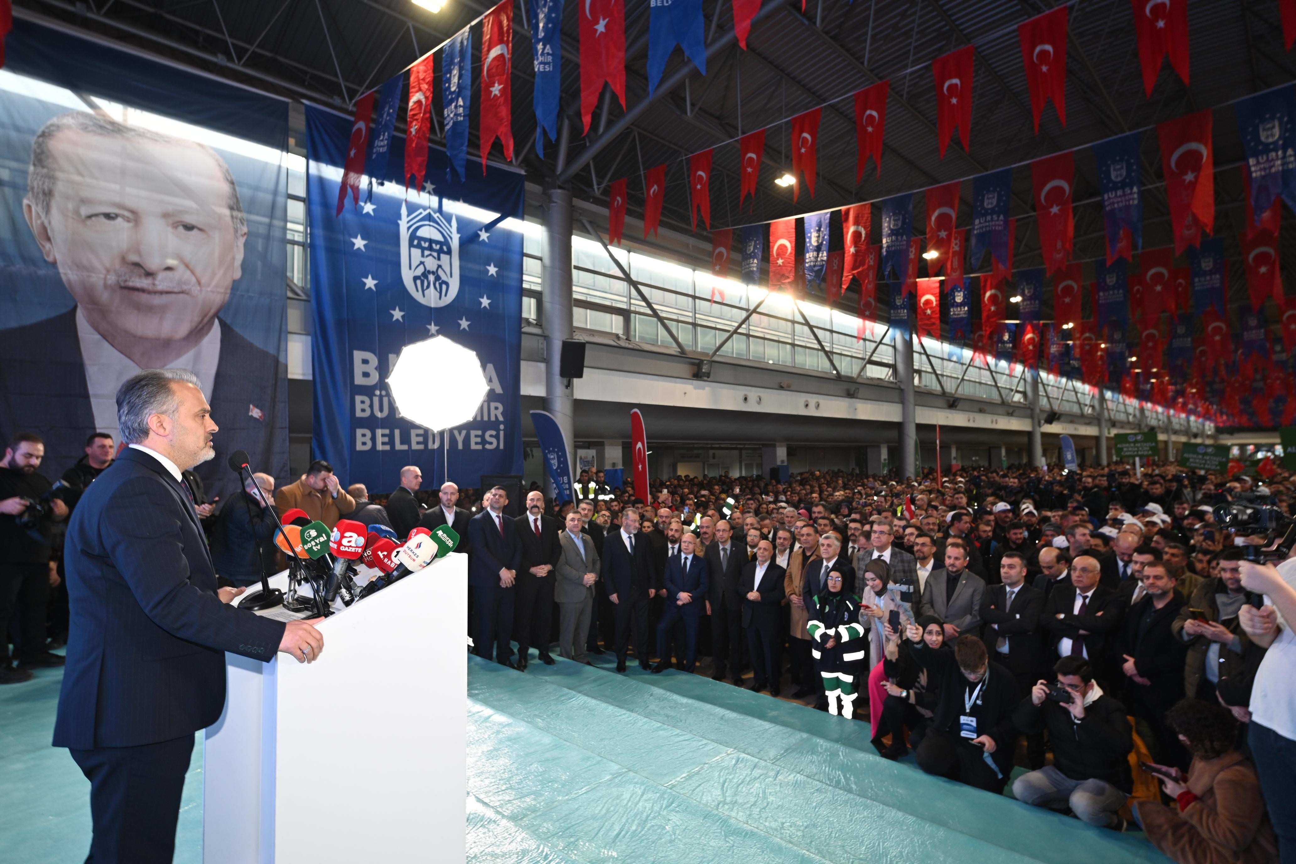 Bursa Büyükşehir Belediye Başkanı Alinur Aktaş, belediye personelinin merakla beklediği maaşlardaki iyileştirme oranlarını, personelin yoğun katılım gösterdiği toplantıda kamuoyu ile paylaştı. Personele seslenen Başkan Aktaş, zor zamanlardan ve sıkıntılı günlerden geçtiklerini ancak çok güçlü bir aile ve kurum olduklarını söyledi. Ailenin her bir ferdinin çok değerli ve kıymetli olduğunu belirten Başkan Alinur Aktaş, her buluşmada çalışanları dinlediğini, kulak verdiğini ve çözüm üretmeye çalıştığını ifade etti. Sahada, direksiyon başında veya masa başındaki her bir çalışanın büyük aşkla ve özveriyle çalıştığını bildiğini dile getirdi. Birlik ve beraberlik ruhuyla 6 yılı geride bıraktıklarını anlatan Başkan Aktaş, “Bugüne kadar şehrimize hizmet etmiş tüm büyüklerimize teşekkür ediyorum. Ben çok kutlu bir şehre hizmet ediyorum. Bu şehrin her bir karış toprağı şehit kanlarıyla sulanmış. Çanakkale’de en fazla şehit veren vilayet burası. Bu şehir Osmanlı’nın 6 tane padişahına, yüzlerce Allah dostuna ev sahipliği yapıyor. Bu şehir kadim medeniyetimizin izlerini her bir köşesinde taşıyor. Bursa’nın her bir köşesinde çalışan arkadaşlarımızın izi var, alın teri var. Ne mutlu sizlere ki Bursa’nın geleceğinde hayırla ve duayla yad edileceksiniz. Ekip ruhuyla çalışarak birçok zorluğa el birliğiyle karşılık verdik. Dünyayı esir alan pandemi yaşadık. Herkes evlerindeydi, biz sokaklardaydık. Asfalt yaptık, kilit parke yaptık, ilaçlama yaptık, garibanların evlerine sıcak yemek olarak gittik. Allah hepinizden razı olsun. Büyük bir deprem yaşadık. Deprem bölgesinde her bir kardeşimin ayrı ayrı katkısı var. Büyükşehir Belediyesi Antakya’da evde bakım oldu, erzak dağıtımı oldu, 3 tane konteyner kent oldu. Sel oldu, taşkın oldu, yangın oldu sizin özveriniz ve fedakarlığınızla ben o şehirlerde göğsümü gere gere gezdim. Hep beraber bunları gerçekleştirdik. Bugüne kadar şehrimize, farklı şehirlerde ve Balkanlar’daki çalışmalarda destek veren arkadaşlarımıza teşekkür ediyorum” diye konuştu.