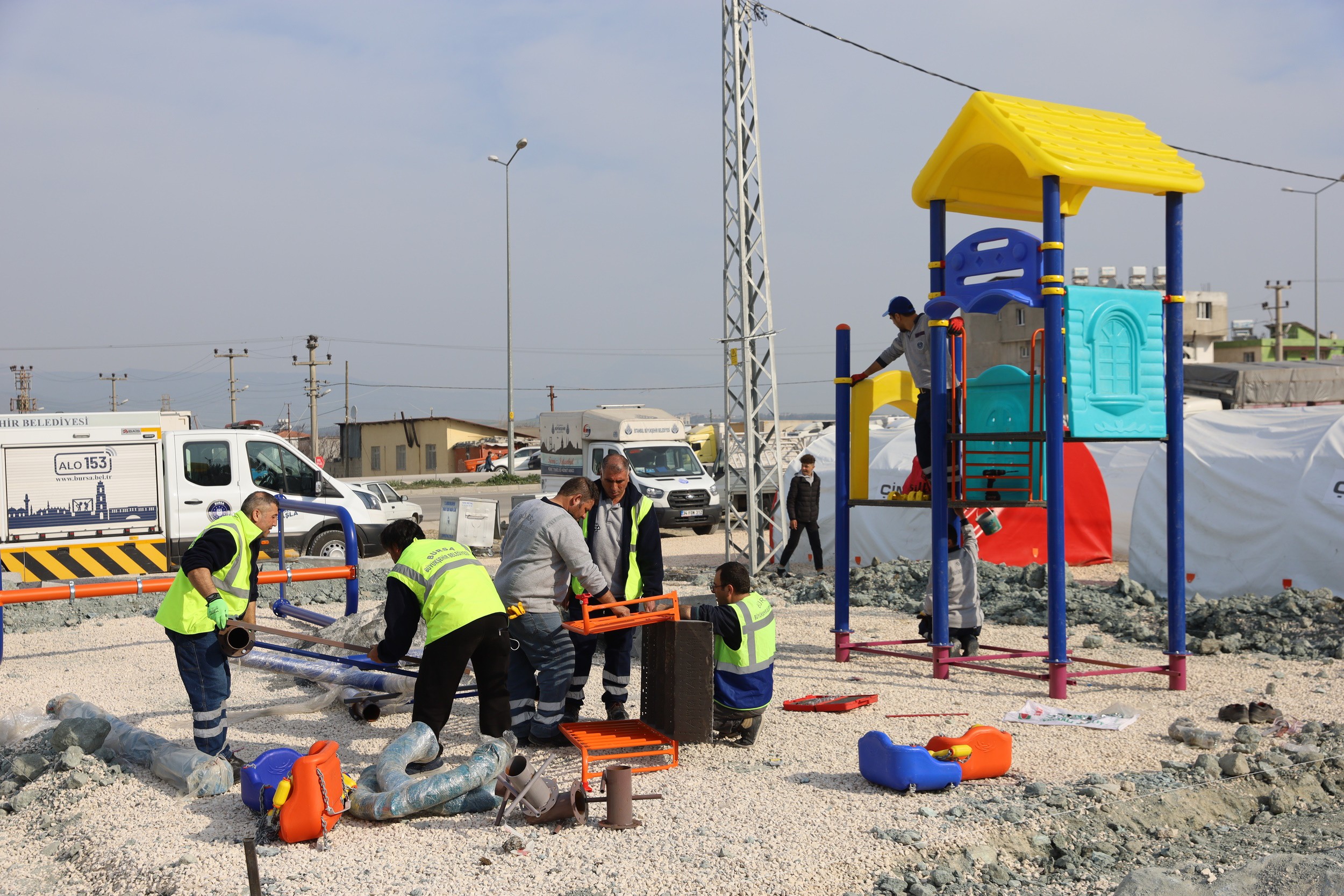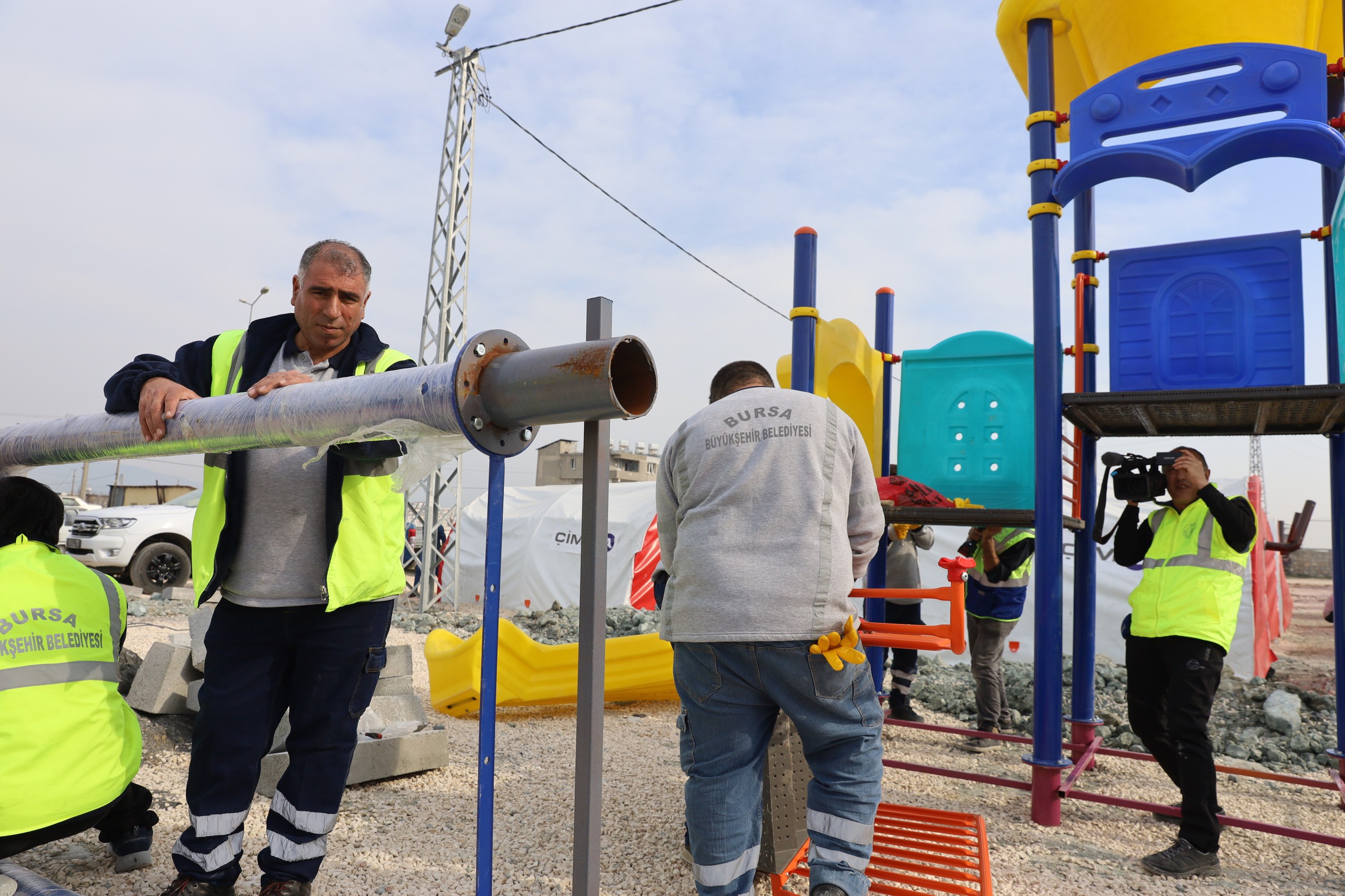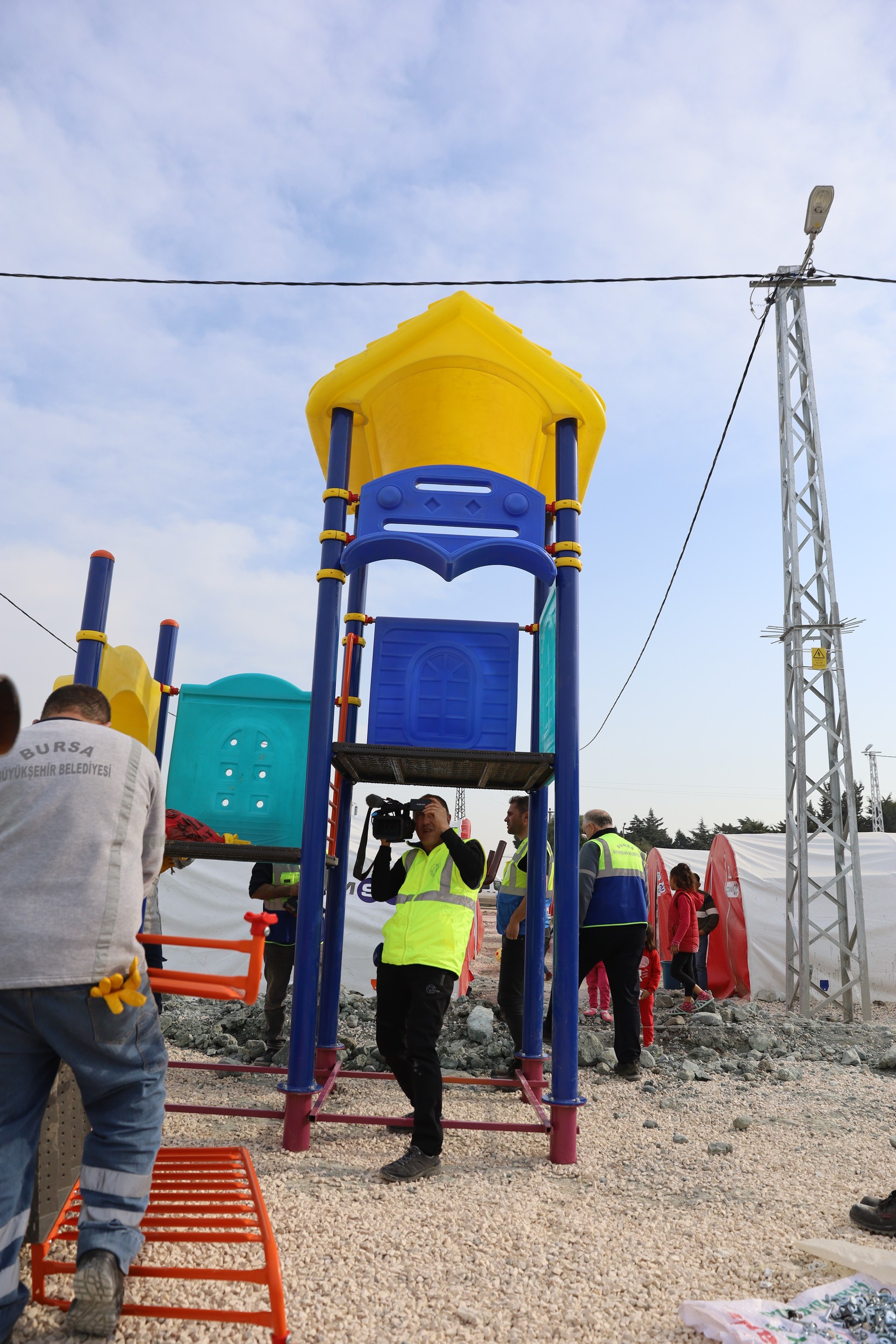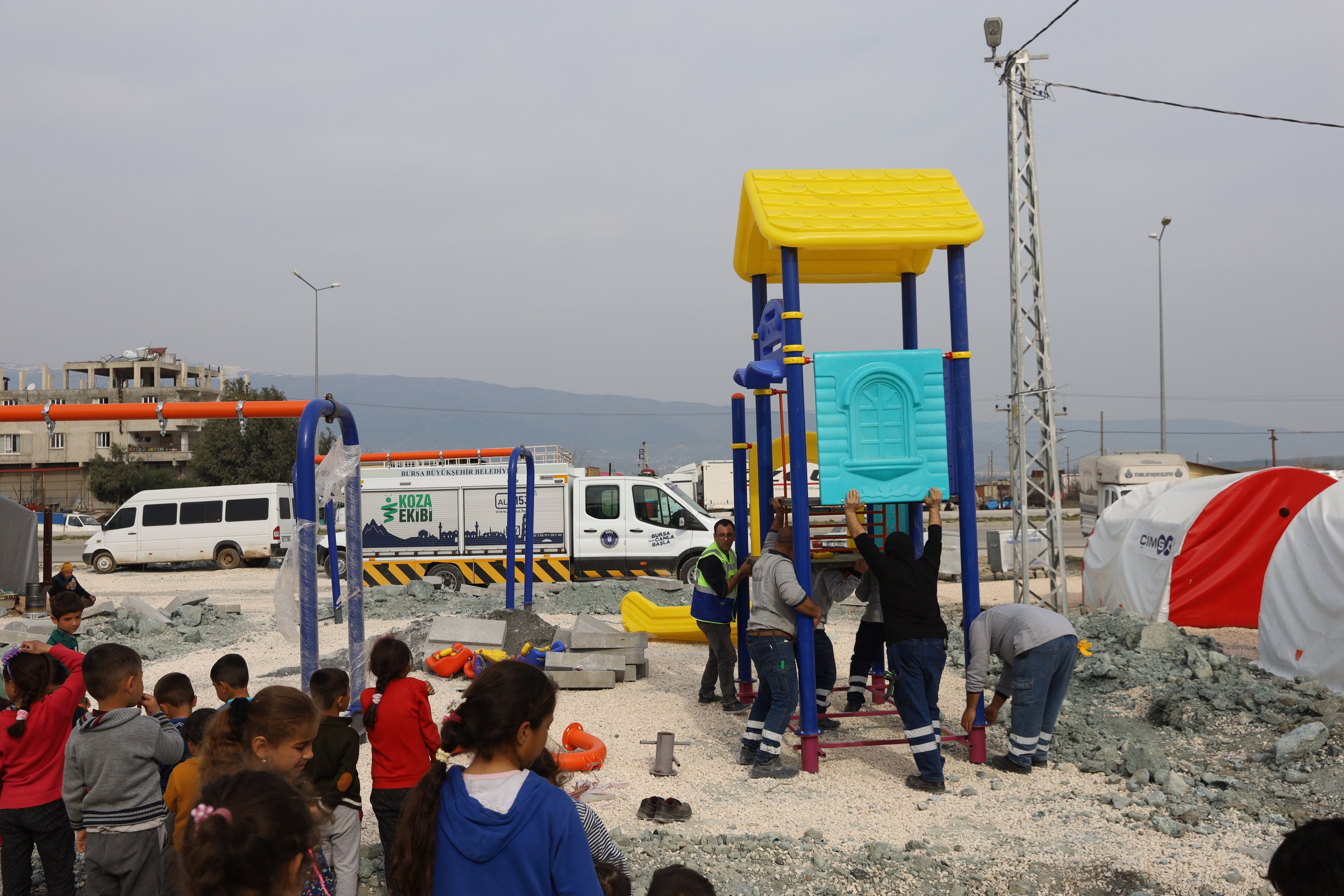 Hatay’da deprem mağduru vatandaşların yaralarını sarmak için köy köy mahalle mahalle gezen Bursa Büyükşehir Belediyesi ekipleri, depremzede çocukları da ilk günden beri ihmal etmiyor. Hataylı küçük depremzedeleri mutlu edebilmek için gördükleri her yerde oyuncak veren ekipler, bu kez de çadır ve konteyner kentlerde oyun parkı kurulumuna başladı.