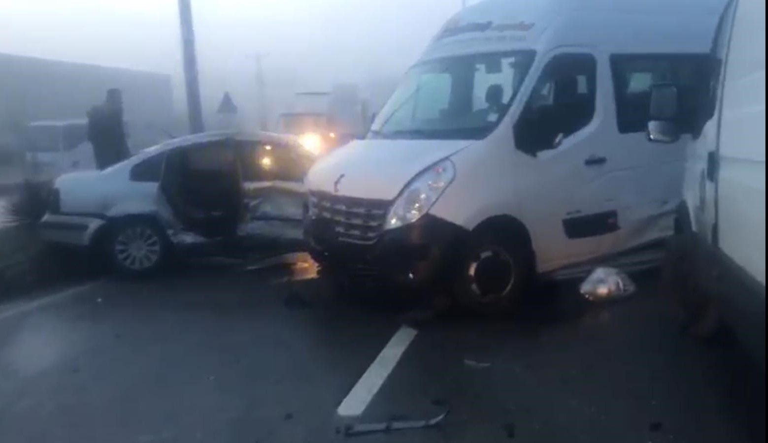 Zonguldak yönüne giden işçi servisi, Gecen köyü mevkisinde yoldaki buzlanma ve yoğun sis nedeniyle kayarak refüje çarptı. İşçi servisinin arkasından gelen 10 araç da duramayarak birbiriyle çarpıştı.