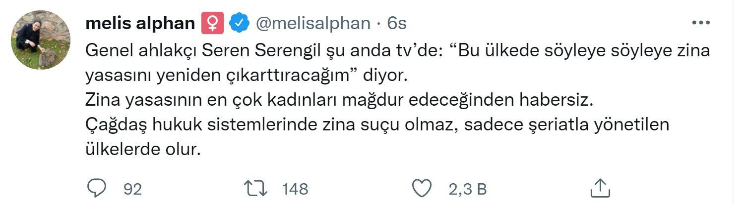 “Genel ahlakçı Seren Serengil şu anda tv’de: “Bu ülkede söyleye söyleye zina yasasını yeniden çıkarttıracağım” diyor. Zina yasasının en çok kadınları mağdur edeceğinden habersiz. Çağdaş hukuk sistemlerinde zina suçu olmaz, sadece şeriatla yönetilen ülkelerde olur.”