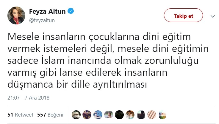 Kadın dernekleriyle iş tutarak aile kurumunu hedef alan yorumlarıyla tanınan feminist avukat Feyza Altun, İslam, aile ve erkek düşmanlığı yorumlarıyla tanınıyor.