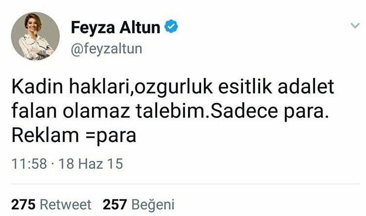 Kadın hakları, özgürlük, eşitklik ve adelet olmadığını dile getiren Altun, asıl meselesinin reklam ve para olduğunu itirafında bulundu.