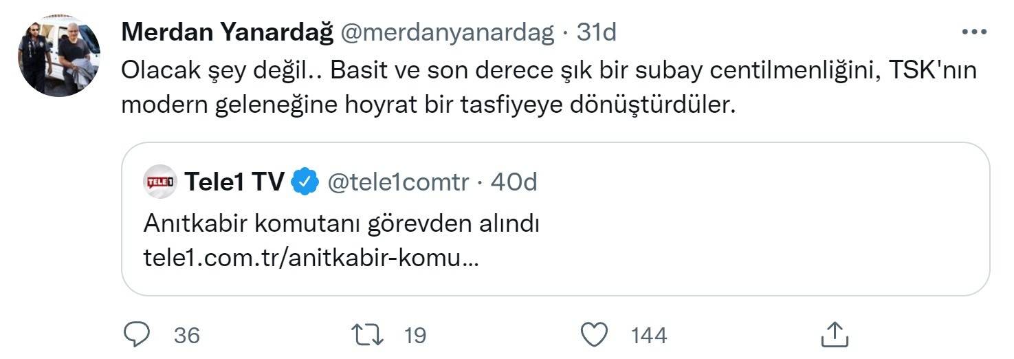 Twitter hesabından paylaşımda bulunan Merdan Yanardağ, "Olacak şey değil... Basit ve son derece şık bir subay centilmenliğini, TSK'nın modern geleneğine hoyrat bir tasfiyeye dönüştürdüler." dedi.