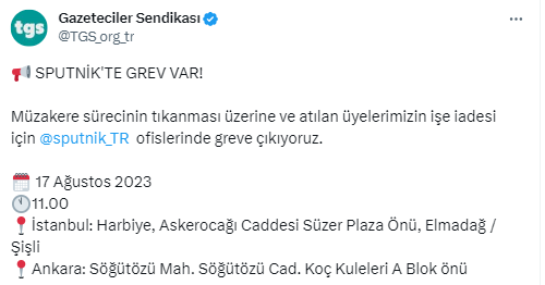 Mesajda, "Sputnik'te grev var! Müzakere sürecinin tıkanması ve üyelerimizin kararı ile Sputnik Türkiye bürolarında greve çıkıyoruz" denildi.