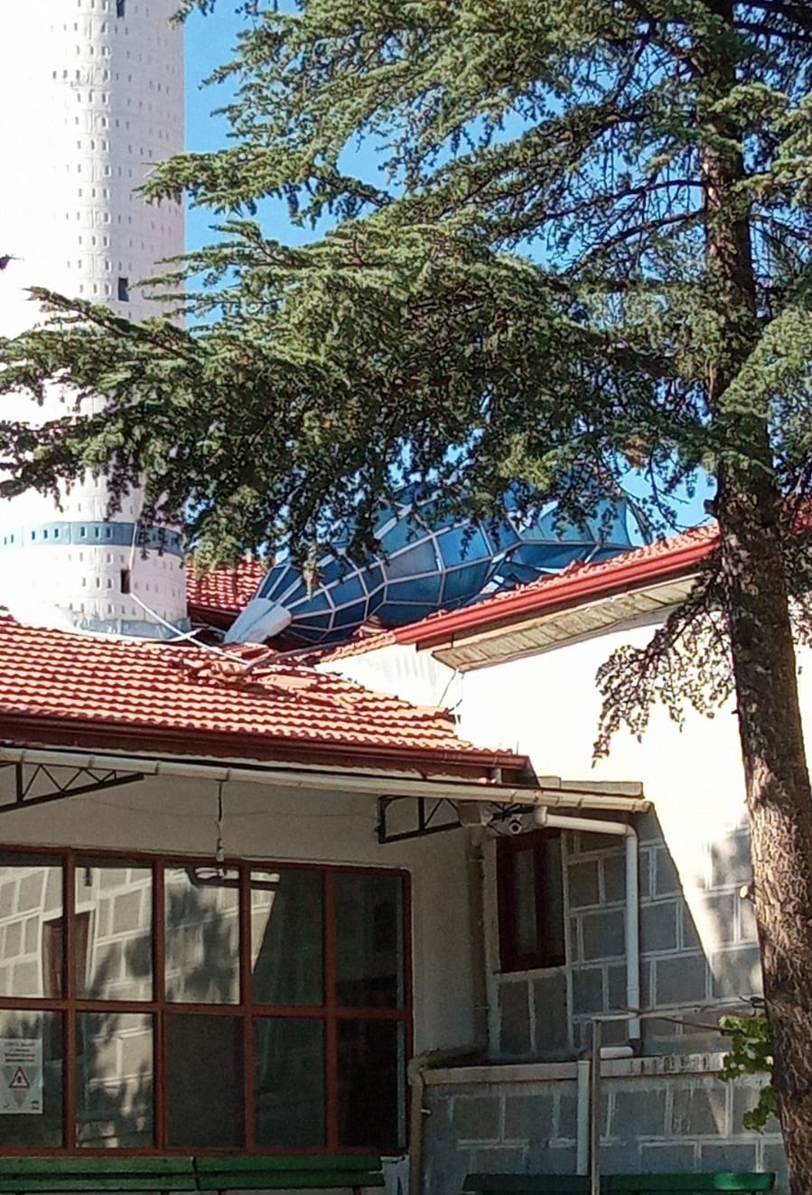 Çorum'un Sungurlu ilçesinde etkili olan fırtına nedeniyle bir caminin minaresinin külahı yıkıldı.