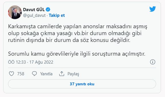 Konunun incelendiğini bildiren Gül, "Karkamış'ta camilerde yapılan anonslar maksadını aşmış olup sokağa çıkma yasağı gibi bir durum olmadığı gibi rutinin dışında bir durum da söz konusu değildir. Sorumlu kamu görevlileriyle ilgili soruşturma açılmıştır." ifadelerini kullandı.