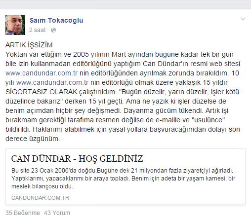 Saim Tokacoğlu Facebook'tan yaptığı açıklamada şunları söyledi; "Yoktan var ettiğim ve 2005 yılının Mart ayından bugüne kadar tek bir gün bile izin kullanmadan editörlüğünü yaptığım Can Dündar'ın resmi web sitesi www.candundar.com.tr nin editörlüğünden ayrılmak zorunda bırakıldım. 10 yılı www.candundar.com.tr nin editörlüğü olmak üzere yaklaşık 15 yıldır SİGORTASIZ OLARAK çalıştırıldım. "Bugün düzelir, yarın düzelir, işler kötü düzelince bakarız" derken 15 yıl geçti. Ama ne yazık ki işler düzelse de benim açımdan hiçbir şey değişmedi. Dayanma gücüm tükendi. Artık işi bırakmam gerektiği tarafıma resmen değilse de e-maille ve "usulünce" bildirildi. Haklarımı alabilmek için yasal yollara başvuracağımdan dolayı son derece üzgünüm."