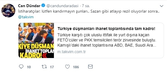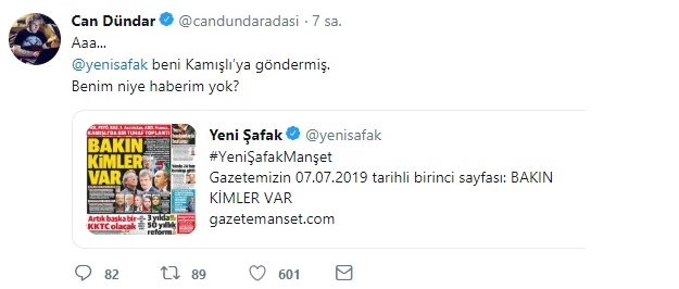 Yeni Şafak Gazetesi söz konusu haberde, "Türkiye karşıtı çok uluslu ittifak ile yurt dışına kaçan FETÖ’cüler ve PKK temsilcileri terör zirvesinde buluştu. Kamışlı’daki ihanet toplantısına ABD, BAE, Suudi Arabistan, Mısır, Ürdün, Irak, Fransa, Bahreyn ve Kanada’dan önemli isimler katıldı. Kırmızı bültenle aranan Can Dündar, Almanya’ya kaçan Hayko Bağdat, firari FETÖ’cü Ergun Babahan da oradaydı" ifadelerini kendince alaya alan Dündar, her zaman olduğu gibi yalana sığınarak şu alçak ifadeleri kullandı: