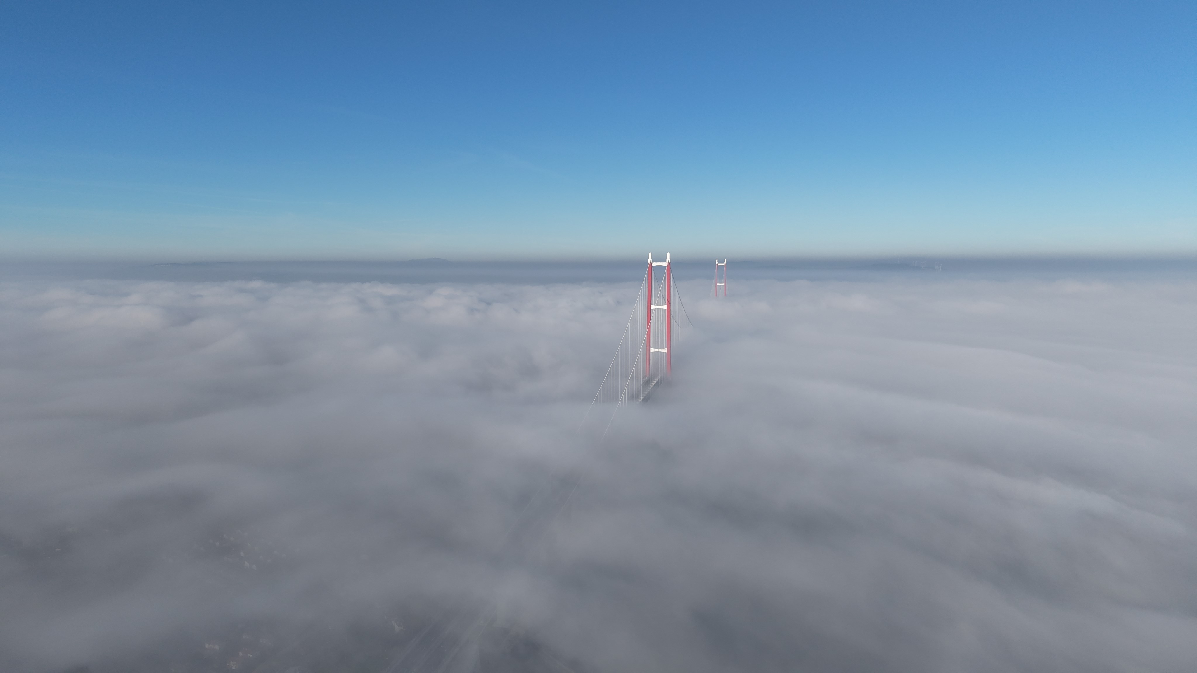 Çanakkale Boğazı, sabah saatlerinden itibaren etkili olan yoğun sis nedeniyle çift yönlü olarak transit gemi geçişlerine kapatıldı. Görüş mesafesinin düşmesiyle birlikte deniz ulaşımı durma noktasına gelirken, dünyanın en uzun orta açıklıklı köprüsü olan 1915 Çanakkale Köprüsü dron ile havadan görüntülendi.
