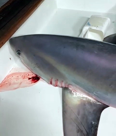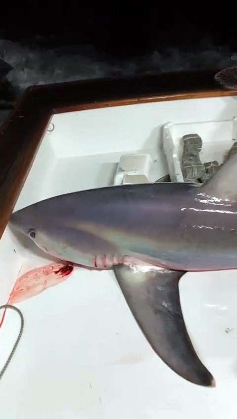 Yaklaşık 1 saatlik süren mücadele sonrasında köpek balığını tekneye alan balıkçılar, o anları da cep telefonu ile kayıt altına aldılar.