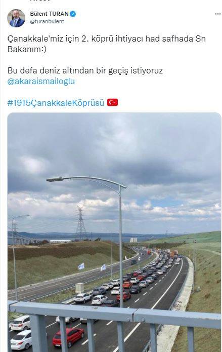 Resmi sosyal medya hesabından paylaşımda bulunan AK Parti Grup Başkanvekili Bülent Turan, “Çanakkale'miz için 2. köprü ihtiyacı had safhada Sn Bakanım:) Bu defa deniz altından bir geçiş istiyoruz @akaraismailoglu #1915ÇanakkaleKöprüsü” ifadelerine yer verdi.