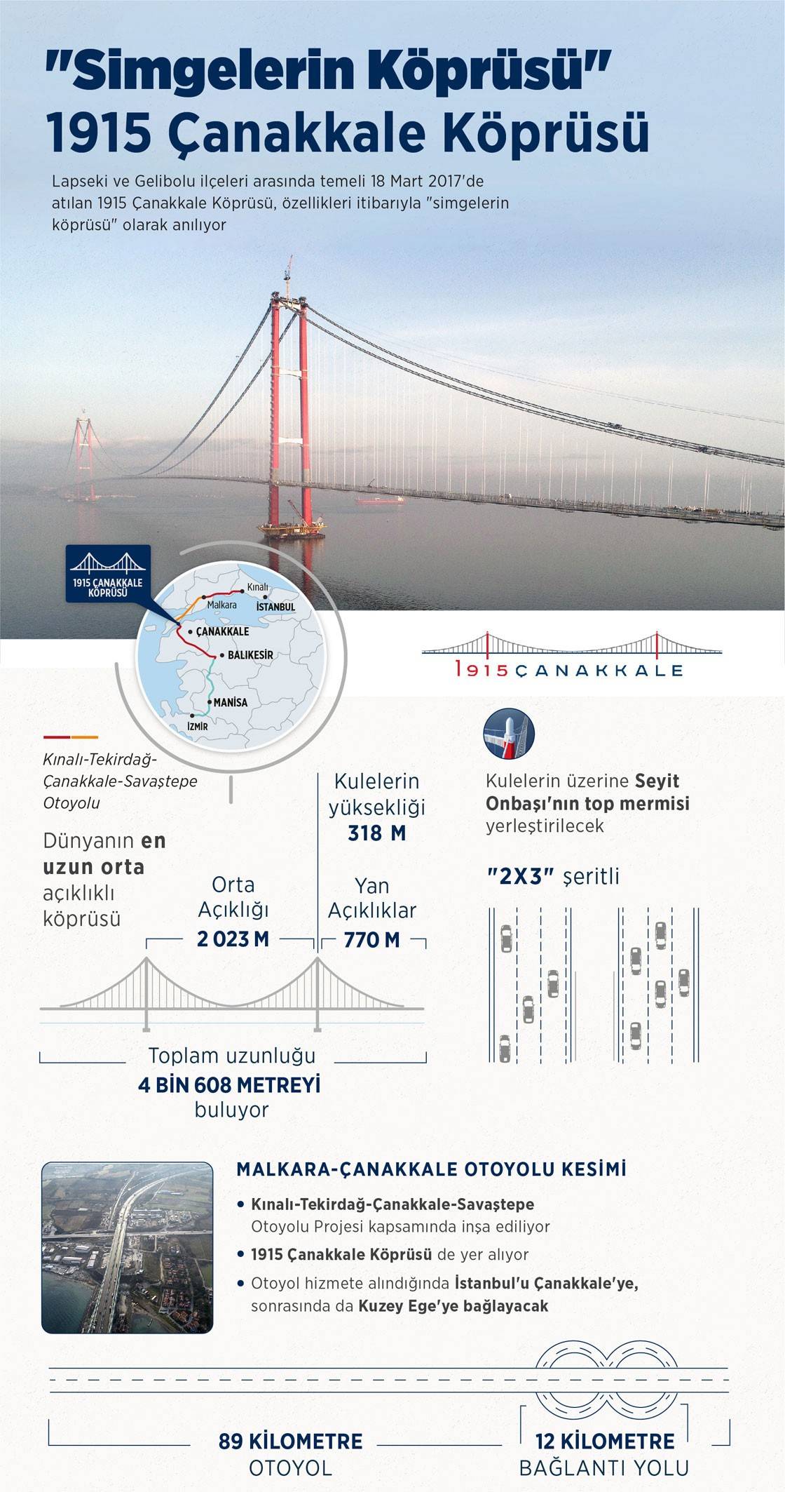 Türkiye'nin mega projeleri arasında yer alan ve temeli 18 Mart 2017'de atılan "1915 Çanakkale Köprüsü"nün 18 Mart’ta Cumhurbaşkanı Recep Tayyip Erdoğan tarafından hizmete sunulacak. Kınalı-Tekirdağ-Çanakkale-Savaştepe Otoyolu Projesi kapsamında yer alan Malkara-Çanakkale Otoyolu Kesimi Yap-İşlet-Devret Projesi, 89 kilometre otoyol, 12 kilometre bağlantı yolu olmak üzere toplam 101 kilometreyi buluyor.