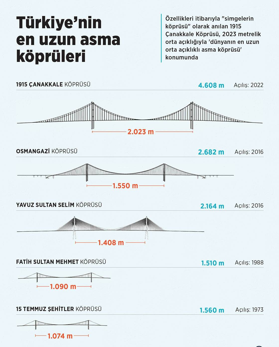 Çanakkale Köprüsü kaç metre uzunlukta? 1915 Çanakkale Köprüsü Cumhurbaşkanı Erdoğan'ın katılımı ile hizmete girdi. Proje Asya ve Avrupa kıtlarını Çanakkale Boğazı'nda ilk kez birbirine bağladı. Asya ile Avrupa kıtalarını Çanakkale Boğazı'nda ilk kez birbirine bağlayan köprü, Lapseki Şekerkaya ile Gelibolu Sütlüce mevkiinde inşa edildi. Cumhuriyet tarihinin mega projelerinden biri olan 1915 Çanakkale Köprüsü'ne, 18 Mart 2017 yılında Cumhurbaşkanı Recep Tayyip Erdoğan’ın temelini atmasıyla başlamıştı.