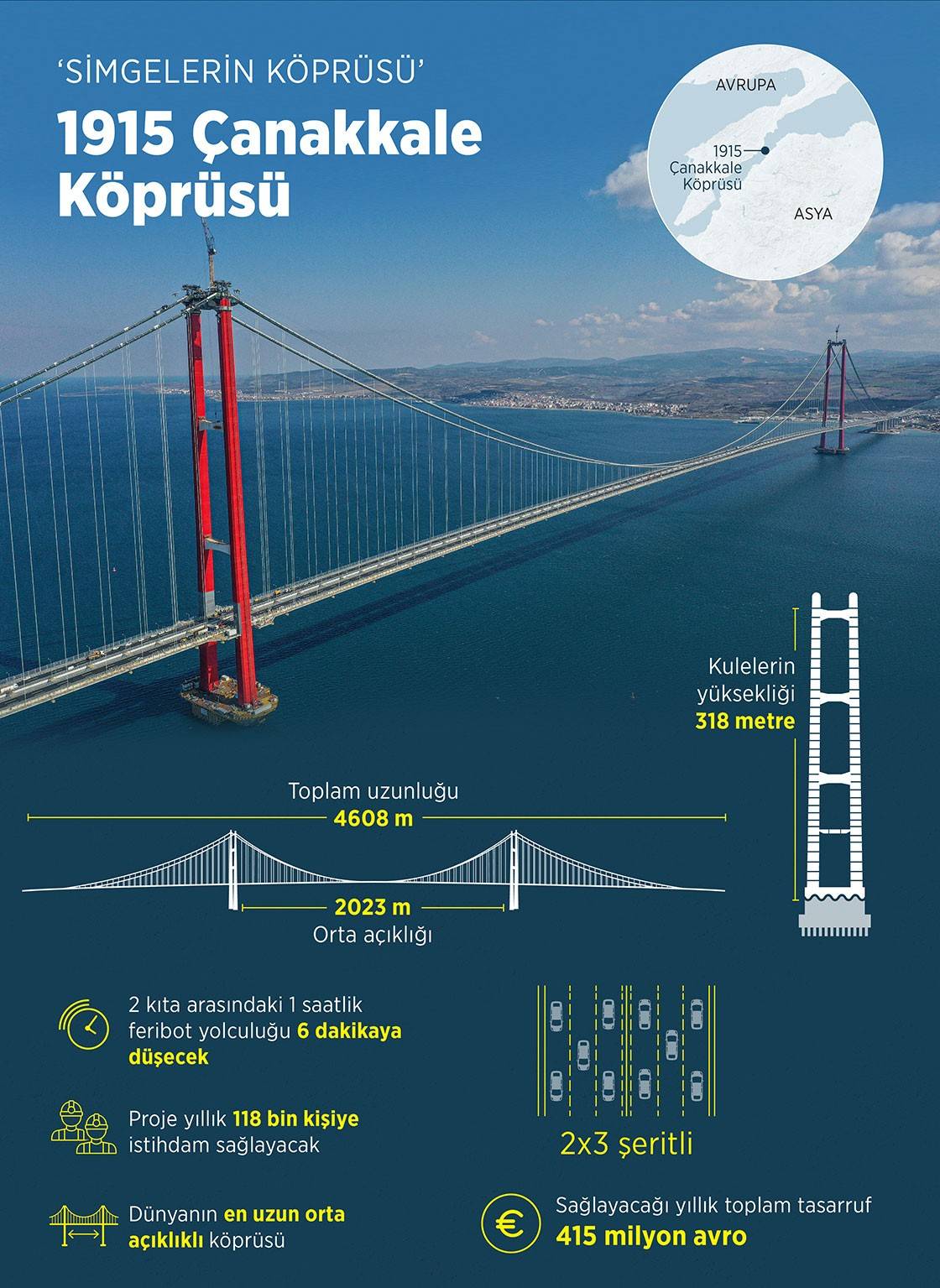 Çanakkale Deniz Zaferi'nin kazanıldığı gün olan 18 Mart'ı simgeleyen 318 metrelik yüksekliğiyle 1915 Çanakkale Köprüsü'nün kuleleri, Fransa'nın başkenti Paris'in simgesi olan ve 300 metre yüksekliğe sahip Eyfel Kulesi'ni geçti.