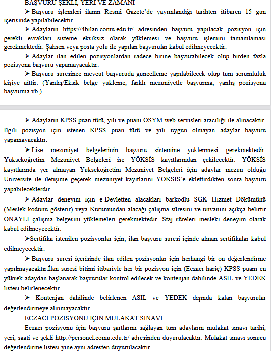 Onsekiz Mart Üniversitesi personel alımına başvuru işlemleri, https://4bilan.comu.edu.tr/ adresinden yapılacak olup 20 Nisan 2021 tarihine kadar devam edecek. Şahsen veya posta yolu ile yapılan başvurular kabul edilmeyecektir.