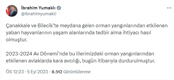 Söz konusu kararı sosyal medya hesabından duyuran Tarım ve Orman Bakanı İbrahim Yumaklı “Çanakkale ve Bilecik’te meydana gelen orman yangınlarından etkilenen yaban hayvanlarının yaşam alanlarında tedbir alma ihtiyacı hasıl olmuştur. 2023-2024 Av Dönemi’nde bu illerimizdeki orman yangınlarından etkilenen avlaklarda kara avcılığı, bugün itibarıyla durdurulmuştur.” ifadelerini kullandı.