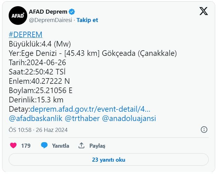 Çanakkale Gökçeada'da 4.4 büyüklüğünde bir deprem meydana geldi. Depremi AFAD son dakika olarak duyurdu. Yerin 15 kilometre derinliğinde meydana gelen deprem kısa süreli paniğe neden oldu.