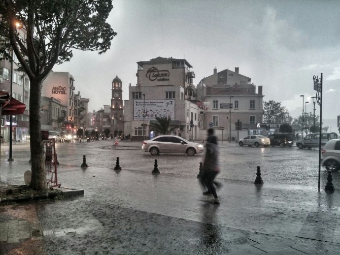 Çanakkale’de, güneşli bir günün ardından, akşam saatlerinde aniden bastıran sağanak yağış, vatandaşları hazırlıksız yakaladı. Bir anda gök gürültülü sağanak yağışın altında kalan vatandaşlar, saçaklara sığınarak kendilerini korumaya çalıştı. Kısa süreli dolu halde yağan yağmur, bazı caddelerde de su birikintilerine neden oldu.