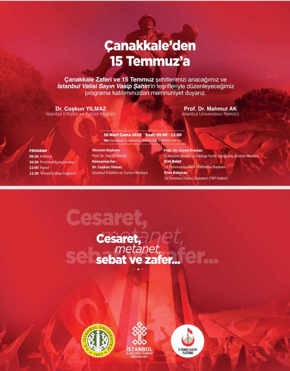 İstanbul Üniversitesi, İstanbul İl Kültür ve Turizm Müdürlüğü ve 15 Temmuz Gaziler Platformu tarafından 16 Mart tarihinde Çanakkale Zaferi ve 15 Temmuz şehitlerinin anılacağı program yapılacaktır.