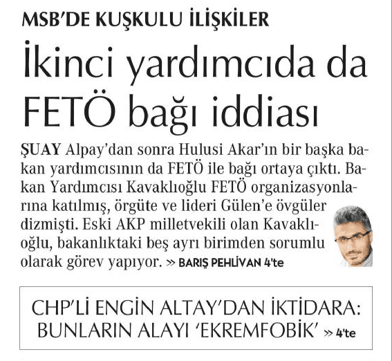 "Akar'ın yardımcıları geçmiş tarihte FETÖ organizasyonlarına katılmış" edebiyatını sürdüren Pehlivan, "Şuay Alpay'dan sonra Hulusi Akar'ın bir başka bakan yardımcısının da FETÖ ile bağı ortaya çıktı. Bakan Yardımcısı Kavaklıoğlu FETÖ organizasyonlarına katılmış, örgütü ve lideri Gülen'e övgüler dizmişti. Eski AKP milletvekili olan Kavaklıoğlu, bakanlıktaki beş ayrı birimden sorumlu olarak görev yapıyor." dedi.
