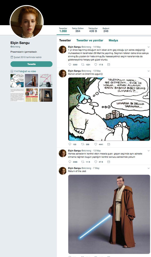 Oyuncu Elçin Sangu da, tıpkı Emin Çapa gibi seçmen kaydının silindiği yalanına başvurmuştu. Sangu, “Herkes adreslerini kontrol etsin. Mesela şu an geçen seçimde aynı adreste olmama rağmen bugün yaptığım kontrol sonucu adresimde yokum.” diyerek algı oluşturmaya çalışmıştı Gezi’ci oyuncu Elçin Sangu'nun iddiasının gerçeği yansıtmadığı ortaya çıkmış ve söz konusu iddia, TC. Nüfus ve Vatandaşlık İşleri Genel Müdürlüğü tarafından yalanlanmıştı. Müdürlüğün Twitter hesabından yapılan açıklamada, "29.03.2019 tarihinde elektronik imza ile adres değişikliği yaptığınız anlaşılmış olup, adres kayıtlarınızda herhangi bir sorun bulunmamaktadır. Ayrıca adres bilgilerinizi adres.nvi.gov.tr üzerinden de kontrol edebilirsiniz." ifadeleri kullanılmıştı.