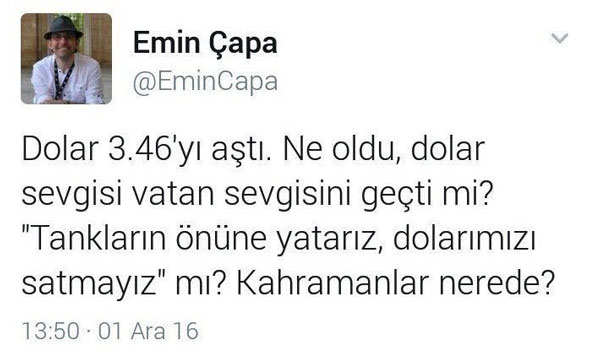 “Dolar 3,6'yı aştı. Ne oldu, dolar sevgisi vatan sevgisini geçti mi? "Tankların önüne yatarız, dolarımızı satmayız" mı? Kahramanlar nerede?”