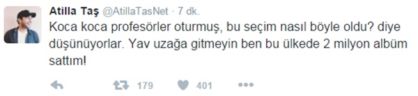 Ardından, koca koca profesörlerin oturup, seçim sonucunun neden böyle olduğunu düşündüğünü söyleyen Taş, "Yav uzağa gitmeyin ben bu ülkede 2 milyon albüm sattım!" diyerek kendi albümü üzerinden milleti aşağıladı.